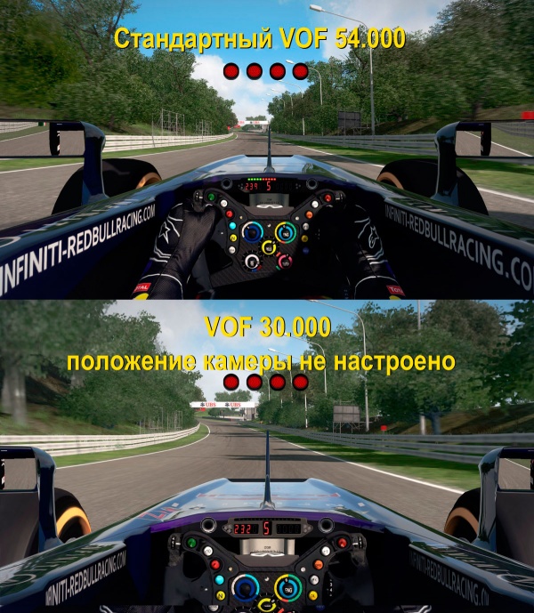Изменяйте параметры по порядку, начиная с VOF. Поле зрения советую выбирать один раз, и использовать это значение для всех машин. Что бы не было разницы при пересаживании из одной машины в другую. Минимальное приемлемое значение, как мне показалось 30.000. При этом поле зрения очень узкое, объекты крупные, трасса широкая. Ощущение скорости слабое, но главное, форма поворотов уже сложно определяется. Ездить можно, но это грань..
