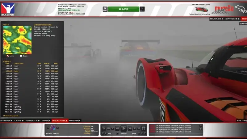 Теперь игрокам придется следить за погодой, но все должны знать, что это просто прогноз! Вы можете пойти в гонку, которая имеет высокую вероятность дождя с темными облаками, нависающими на горизонте, и обнаружить, что дождь так и не пошел. Или вы можете участвовать в гонке, где вероятность дождя относительно низкая, но ветер начинает дуть определенным образом, и вы сталкиваетесь с внезапной бурей. Чем дольше длиться гонка, тем больше неопределенность, поэтому гонщики на выносливость должны быть хорошо осведомлены о ситуации. Конечно, будет обновлен ваш споттер и инженеры на мостике будут вас информировать о предстоящих погодных изменениях.