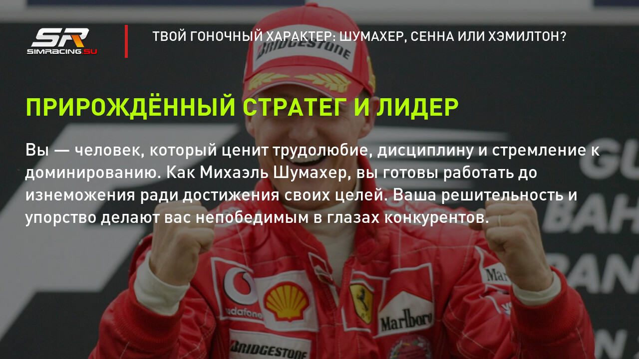 Твой гоночный характер: Шумахер, Сенна или Хэмилтон?