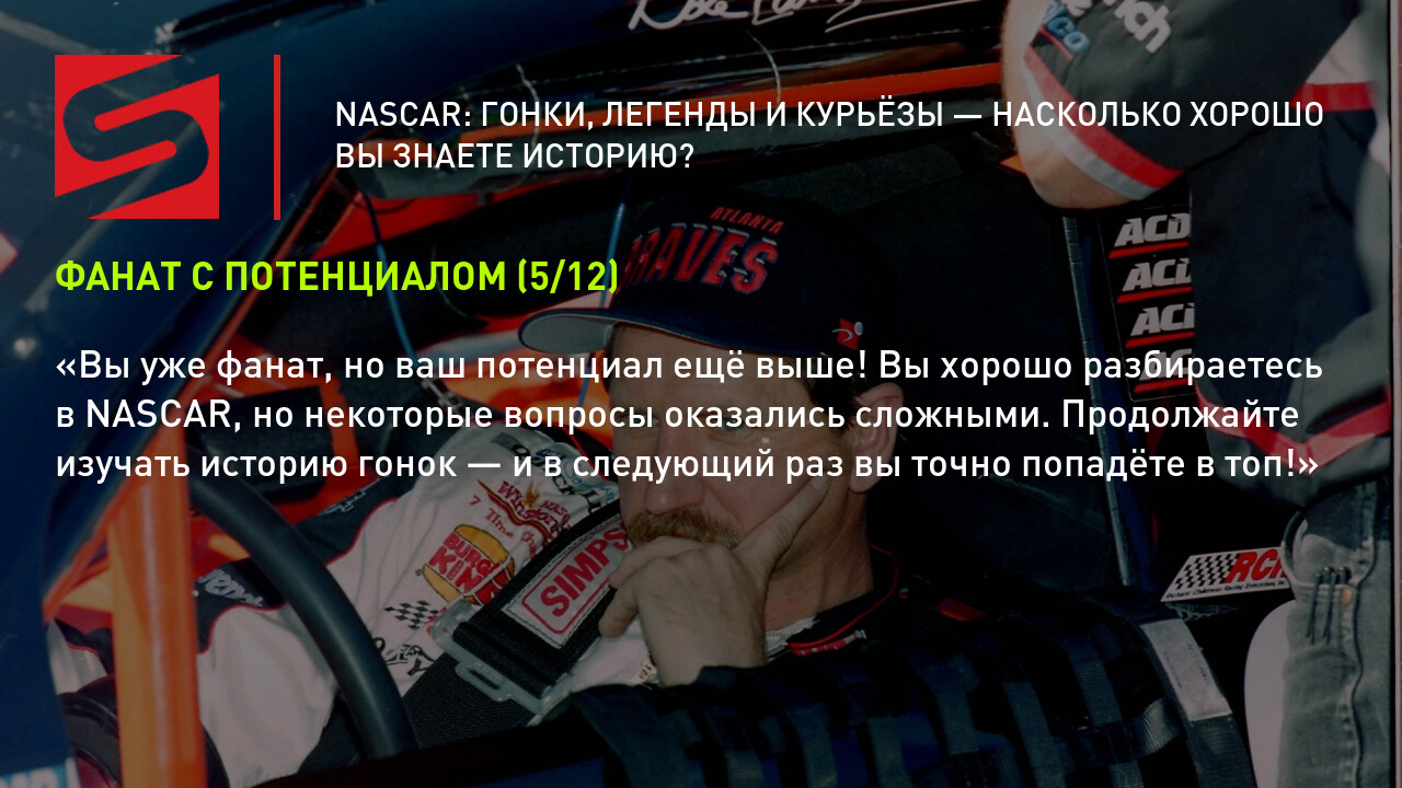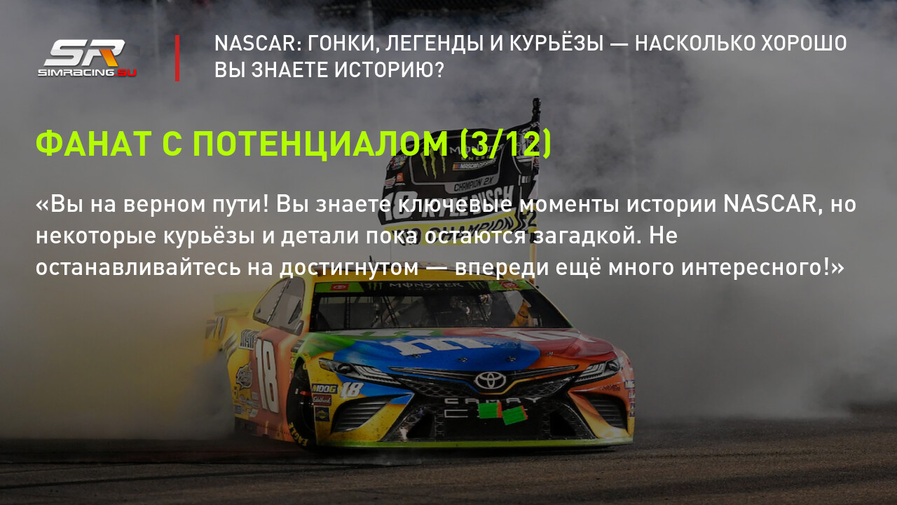 После каждого вопроса вы найдёте подробные комментарии, которые помогут вам узнать больше о NASCAR, даже если ответ был неверным.