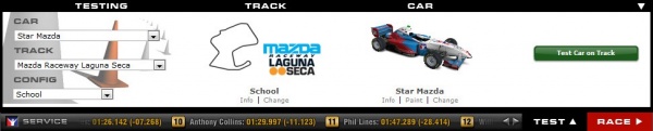- Если вы хотите провести одиночный тестовый заезд, нажмите на черную кнопку “TEST”, в левой части открывшейся Панели тестов с помощью выпадающих меню выберите автомобиль, трассу и ее конфигурацию (в меню выбора конфигурации трассы также имеется специальная сессия Школы гоночного мастерства) . Нажмите на зеленую кнопку “Test Car on Track”, расположенную справа, чтобы запустить игру: