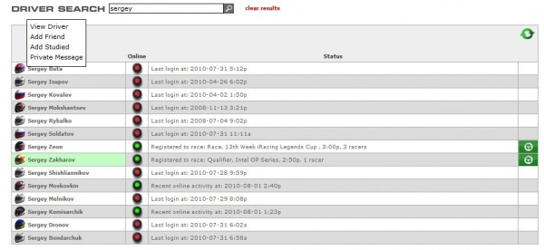 - “Private Message” – отправить пользователю личное сообщение через официальный форум пользователей iRacing.com