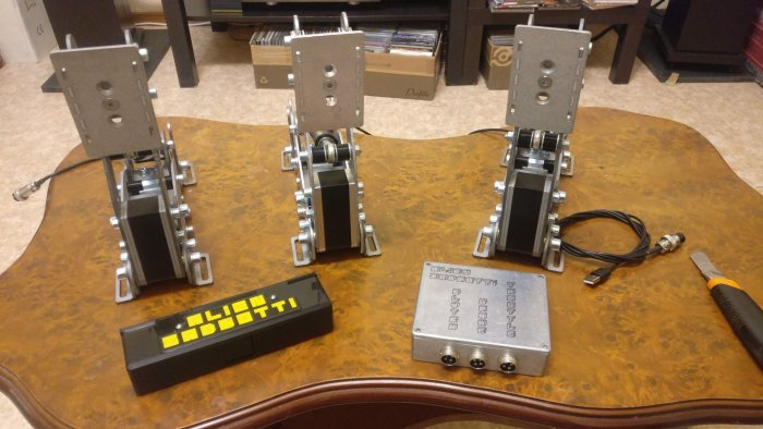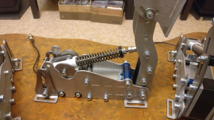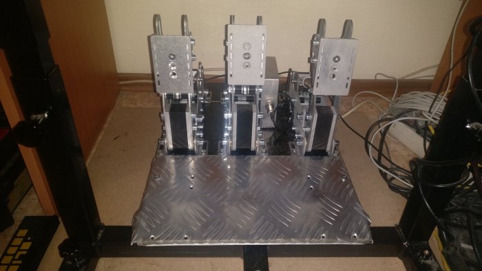 Давно не виделись здесь! Я сегодня с новостями. Как я и говорил, то что я показывал раньше - это был прототип. А то, что есть сегодня это практически готовое изделие в том виде, в котором я хотел его видеть изначально. Внесено достаточно много изменений, но обо всё по-порядку. Сперва нужно сказать, что на тормозе всё так же установлен loadcell на 70kg, а на педали газа и сцепления - потенциометры P260 - именно те, что продаёт LeoBodnar. Производитель заявляет "Rotational Life - 1,000,000 cycles", я стараюсь этому верить и сильно не переживаю. Пробовал использовать роторный датчик холла, но ощутимой разницы для себя не заметил совершенно. Кроме цены. Почему же не loadcell? Потому что планировал так изначально и на сегодняшний день я не нашёл оптимального, компактного и относительно недорогого решения в плане контроллера управления для трёх Loadcell и софта к нему. Возможно, однажды я его найду и всё будет иначе, но на сегодняшний день я использую контроллер Leo Bodnar Load Cell Interface LC-USB. Он очень точно справляется с одним loadcell и двумя потенциометрами, а ещё он хорошо вписался в мою конструкцию. С педалью газа всё осталось практически как и прежде. Я немного уменьшил ширину педали и накладки, а так же поменял форму самой накладки. Так оказалось удобнее делать перегазовку. Что же касается педали тормоза - здесь произошло больше изменений. Во-первых рычаг педали теперь изготовлен из стали. Пластина, к которой крепится тензодатчик - изготовлена из стали 6мм. и приварена к боковым частям рычага. Алюминиевая конструкция, которая существовала до этого была изготовлена аналогично, но долгосрочного натиска не выдержала. Так же я немного переработал комплект демпферов. Теперь каждый эластичный элемент с двух сторон закрыт шайбами с бортиком, которые его центрируют и не позволяют его повредить, нажав педаль сильнее положенного. Состав демпферов прежний. Они всё ещё продолжают меня радовать. Ещё я посчитал нужным добавить противоскользящие накладки на педаль тормоза и сцепления. Я пользуюсь педалями в носках и по гладкому алюминию нога стремилась слегка проскользить. Так же основательно была перестроена педаль сцепления. Раньше при регулировке наклона штока пружины эффект работы корзины сцепления в определённый момент пропадал, то есть не мог существовать при такой настройке. Поэтому была выполнена задача: сохранить широкую зону регулировки силы нажатия, при этом в любом положении сохранить выбор - с эффектом работы корзины или без. Вот так это выглядит сегодня: Финальный штрих всей работы - порошковая покраска стальных деталей подставки и тормоза в цвет "чёрный муар" и мягкий коврик из натуральной кожи, который надёжно крепится к подставке на магнитный винил. Что же впереди? Я хотел бы более подробно показать весь процесс сборки, тонкости конструкции, которых не видно на фото, а так же то бесчисленное множество деталей, которое по первому взгляду на собранное изделие не кажется таким уж и "бесчисленным множеством". Так же я приготовил безмен на 150kg и небольшой стенд, при помощи которого я хотел бы показать графики pedal force/pedal travel для каждой педали. Это обязательно. А на сегодня всё :) Ваш -27 баллов