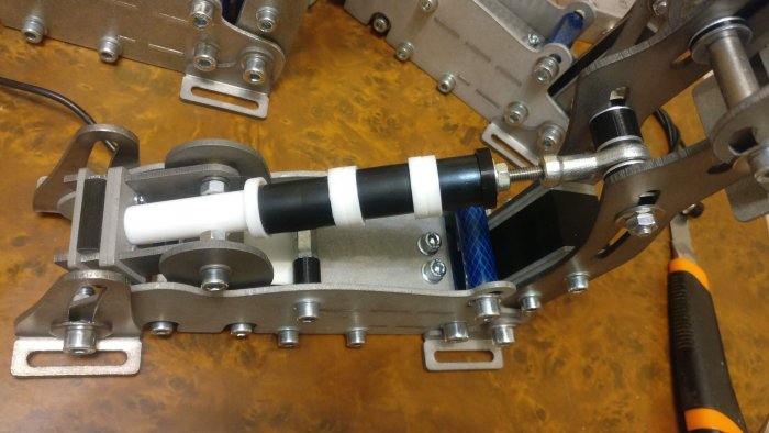 Привет! Наконец, я почти завершил работу над своей очередной поделкой, и спешу поделиться с вами результатом своих трудов! Собственно – мои «юниорские» педали! Вдохновлялся в основном, конечно же, продуктами Heusinkveld Engineering. Кое-какие спорные для меня моменты я обошел и решил по-своему, а вот удачные решения наоборот позаимствовал. На данный момент педали находятся всё ещё в стадии прототипа, поэтому на тормозе используется load cell на 70кг, а на педалях газа и сцепления установлены потенциометры BOURNS. На данный момент я не заметил ни одной причины устанавливать вместо них что-то более дорогое и сложное, кроме одной – сравнительно малое количество циклов работы у потенциометров. Поэтому я уже заказал роторный датчик холла для педали газа. Возможно, кроме долговечности работы датчика я почувствую какую-то разницу в разрешающей способности. Посмотрим. А вот для педали сцепления, на мой взгляд, нет необходимости использовать что-то дороже и сложнее, чем хороший потенциометр. Поэтому, скорее всего, он у меня там будет стоять до тех пор, пока не выйдет из строя, что теоретически должно произойти уже совсем скоро – через 10 000 циклов. Подставка изготовлена из листового металла, с полимерным покрытием. Материал самих педалей – мой любимый листовой АМГ толщиной 3мм. Втулки скольжения и прочие пластиковые части в местах трения - фторопласт-4. Для всех педалей были специально изготовлены пружины с подходящими характеристиками. С помощью регулировок угла штока педали и преднатяга пружины усилие на педали газа и сцепления можно регулировать в очень широком диапазоне. Что же о педали тормоза: можно регулировать преднатяг пружины, который характеризует сопротивление свободного хода, а так же можно регулировать сопротивление рабочего хода посредством разного количества и размеров эластичных элементов. Пока что для наглядности я использую довольно «длинные» упругие элементы, от чего тормоз достаточно мягкий. О упругих элементах: это не полиуретан. Путём экспериментов я выяснил, что его должно быть достаточно много для того, чтобы он заметно демпфировал. Но поскольку я преследовал цель сделать конструкцию компактной и эстетичной, и при этом не потерять функционал – мне пришлось долго и упорно искать замену громоздкому полиуретановому набору. И я его нашёл! Основной рабочий элемент - это обыкновенная толстостенная вакуумная трубка 18х8 (ТУ 38105881-85). Знаю, на фоне дорогостоящих эластомерных пружин моя находка выглядит достаточно стрёмно, но в моей конструкции она работает просто великолепно! Я просто нарезал элементов длиной по 5, 10 и 15мм. и комбинирую их так, как мне удобно! При этом, три коротких элемента (по 5мм.) разделённые друг от друга шайбой, дают очень жёсткий рабочий ход, а длинный (15мм.) даёт возможность продавить тормоз гораздо глубже. При этом, вопреки всем моим сомнениям, такие эластичные элементы получились очень долговечными. По крайней мере на протяжение более, чем полгода они никак не потеряли своих свойств. Посмотрим, что будет дальше!) Дополнительный, мягкий эластичный элемент – это достаточно распространённая силиконовая микропористая резина. Подобный элемент используется в load cell педали тормоза Fanatec CSL ELITE. Рад буду услышать мнение сообщества, тем более, что это всё ещё не финальный вариант и у меня будет возможность исправить или до