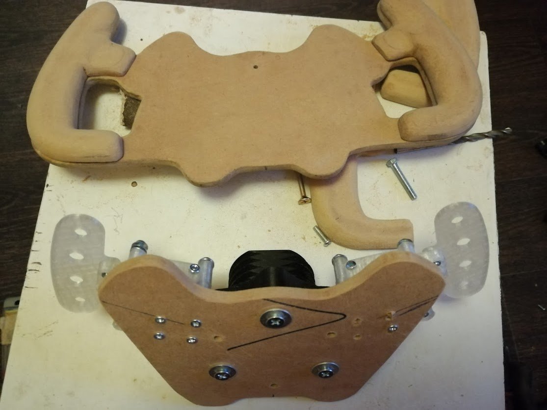 Приветствую, уважаемые коллеги по интересам! Заметил, что на форуме начали появляться и обсуждаться проекты самодельных FFB рулей. Тема для меня очень интересная по нескольким причинам: 1) Мой G27 по мере глубокого погружения в симуляторы перестал меня устраивать по некоторым параметрам, а если точнее, то по всем. 2) Постоянно у меня руки чешутся - дай чего придумать и смастерить. Решение первого пункта для многих очевидно: покупаем топовый девайс и всё сразу станет хорошо. Но это не наш метод. Руки-то чешутся, а амбиции зашкаливают. Потому хочу представить общественности свой скромный проект: В качестве управляющей электроники решено было использовать плату STM32 discovery board с прошивкой MMOS FFB Думаю, для многих не секрет, что наши немецкие коллеги-энтузиасты уже давно сделали и обнародовали схемы и прошивку для STM32, которая после легла в основу ПО для Simucube OSW. STM32 с данной прошивкой может легко организовать нам фидбэк посредством двигателя постоянного тока через соответствующий драйвер (H-Bridge) В качестве привода FFB будем использовать сервомотор постоянного тока 24v (DC servo motor) с отрезанным энкодером. Энкодер вместе с его корпусом отрезал за ненадобностью, т.к. привод будет не прямой, а с редукцией и осуществляться будет посредством ремня. Почему именно такой мотор? Так сложились звёзды. Таких мотора у меня два, достались они совершенно бесплатно в состоянии - муха не сидела. Низкооборотистый и очень моментный мотор. Без нагрузки при 24v прибор насчитал 940rpm. Диаметр мотора 80мм. Управлять этим маленьким моторчиком поручено драйверу bts7960 - подходящие характеристики и доступная цена. Единственный момент: нужно брать оригинал, неоригинал за $5 очень сильно греется и весело горит. Чтобы симулятор понимал, на какой угол повёрнут наш руль, следить за ним будем с помощью роторного энкодера, который будет установлен непосредственно на вал рулевого колеса. Используем китайскую копию OMRON E6B2CWZ6C 1000ppr (что означает 4000cpr) с индексом, для того, чтобы наша база запоминала центр и при каждом включении калибровалась. Для механики привода будем использовать то, что уже имеется - пару алюминиевых шкивов HTD3M 20t и 72t под ремень 15мм. Мои очень примерные расчёты подсказывают, что такое соотношение должно подойти и по скорости и по мощности. А если вдруг что-то пойдёт не так - будем варьировать диаметром ведущего шкива, благо есть в наличии 12t, 15t, 20t, 22t, 24t. Ремешок используем с кевларовым кордиком, т.к. из-за относительно небольшого диаметра ведомого шкива работа ремешку предстоит нелёгкая. Для сборки с ведущим шкивом 20t понадобится ремень на 96 зубов - HTD3M 288. Остальная механическая часть - дюраль и амг. Будет много токарки и фрезеровки. Дабы убедиться в том, что принципиальная схема с использованием платы, энкодера, драйвера и мотора будет работать правильно, нужно было собрать макет. На коленке, с использованием механики очень старого trust ff380, его родного моторчика была собрана принципиальная связка компонентов, которая (не без бубна и танцев) заработала как полагается. Осталось дело за малым - воспроизвести всё в соответствие с чертежами.24 балла