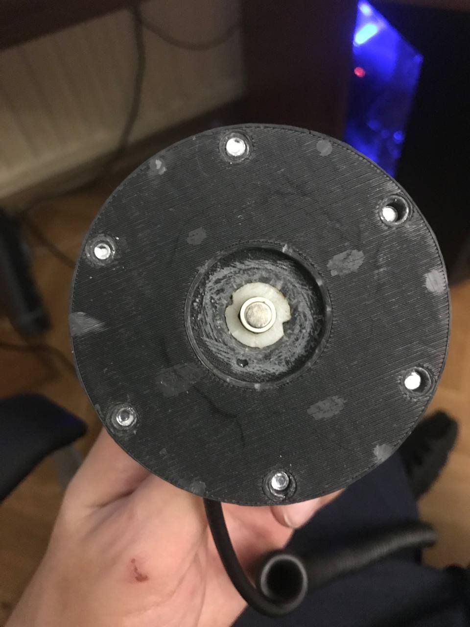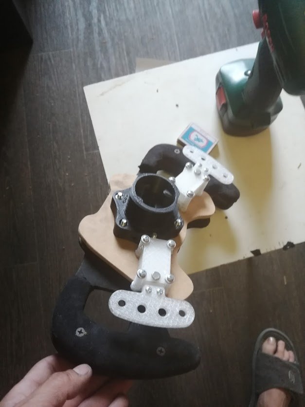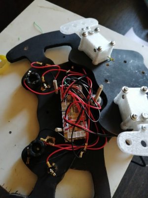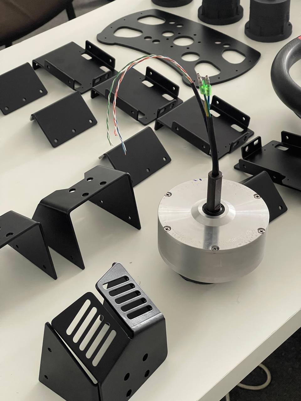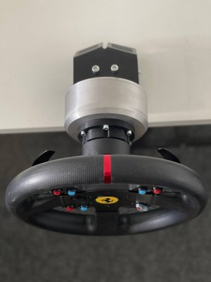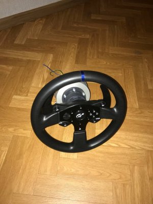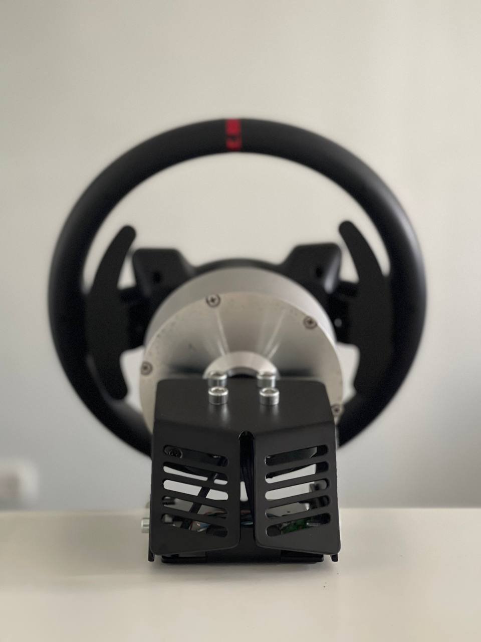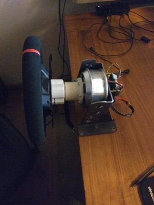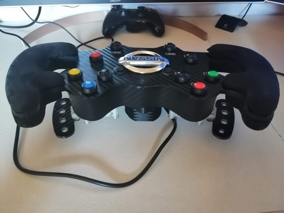 Доброго времени суток, товарищи. Я наконец таки дособрал базу по проекту @propeler. Я хочу выразить огромную благодарность @Koler и @propeler за их непосильную помощь в сборке данного проекта. Без них, я бы наверное забросил его в дальний угол и скорее всего так и не собрал бы. Что есть: Основная плата по проекту @propeler . Мне она досталась от товарища @Koler которая была распаяна и собрана им же Мотор от 6.5 гироскутера. магниты 25мм. Его я разобрал полностью: вытащил вал для того чтобы насквозь его просверлить. Сам корпус был проточен токарем, чтобы убрать рисунок с лицевой стороны. Стенка на лицевой стороне была тонкая для нарезания резьбы. В итоге взял алюминиевые резьбовые клепки и изнутри из установил. Энкодер абсолютный AS5048A. Крови попил он мне много. Первый энкодер я запорол тем что перегрел пятаки куда паяются провода. Качество плат оставляет желать лучшего и при малейшем перегреве пятак остается на проводе. В итоге один из проводов отвалился и я не заметив этого спалил стмку на плате. Устройство перестало определяться и сама СТМка грелась сразу так что палец держать невозможно было. После этого купил на авито дев плату с такой же стмкой и отдал ребятам, кто занимается ремонтом ноутбуков и телефонов, чтобы они на своей паяльной станции ее перепаяли. Пятак восстановить не получилось в итоге заказал другой энкодер. На втором энкодере случился тоже конфуз. Случайно задел один из конденсаторов на плате и в итоге оторванный пятак. Тут у меня получилось подпаяться к дорожке и восстановить пятак и вернуть конденсатор на место. Провод для энкодера - подошел обычный телефонный провод на 6 жил. Проводки тонкие и он как раз в оплетке. Крепление руля, адаптер, и кроштейн для закрепления энкодера мне также прислал @Koler Сам руль Т300RS. Штекер покупал в ЧипДип - MiniDin 6pin Спиральный провод покупал с доставкой из России у товарищей кто занимается ремонтом раций. Подключение к плате сделал из 2 частей. 1 часть идет от базы к стойке, где закреплен разъем резьбовой 5 пиновый. И на самой спиральке уже ответная часть. Сделал так чтобы провод к базе не дергался лишний раз. БП 19 вольт, 9.5 ампер от ноутбука. В итоге на этих выходных дособрал это все. Процесс затянулся месяца на 3, из за ожидания запчастей, иногда выгоранием самого себя из за того что не все получалось. Важно По результату полученной базой очень доволен, после G25 логитека это небо и земля. Где тестил: Assetto Corsa, Assetto Corsa Competizione, iRacing. Будет время попробую в других симуляторах. Эта троица подцепила руль без каких то танцев с бубном. Из нюансов, как в общении с @propeller решили что не хватает 4 бтнки (тормозного резистора) потому что в некоторых ситуациях из за сильного контр руления БП отправляется в защиту на 1-2 секунды. Случается это редко в обычных гонках, но если попробовать подрифтить то тут будет это часто. Так что ждем реализации тормозного резистора в прошивке Можно конечно взять БП помощнее и тогда будет запас. Вроде все, фотографии какие делал в процессе сборки приложу Видео тестов чуть позже. Вчера проехал часовую гонку и кайфанул. Реально на 45% мощности получилась гонка кроссфит, руки с непривычки болели По поводу ощущений - на руле стало ясно где снос передней оси, где блокировка колес, где снос задней оси. Я если честно не гуру в плане рулей, ездил только на г25 логитеке и на реальных тачках - сравнивать особо не с чем в пла