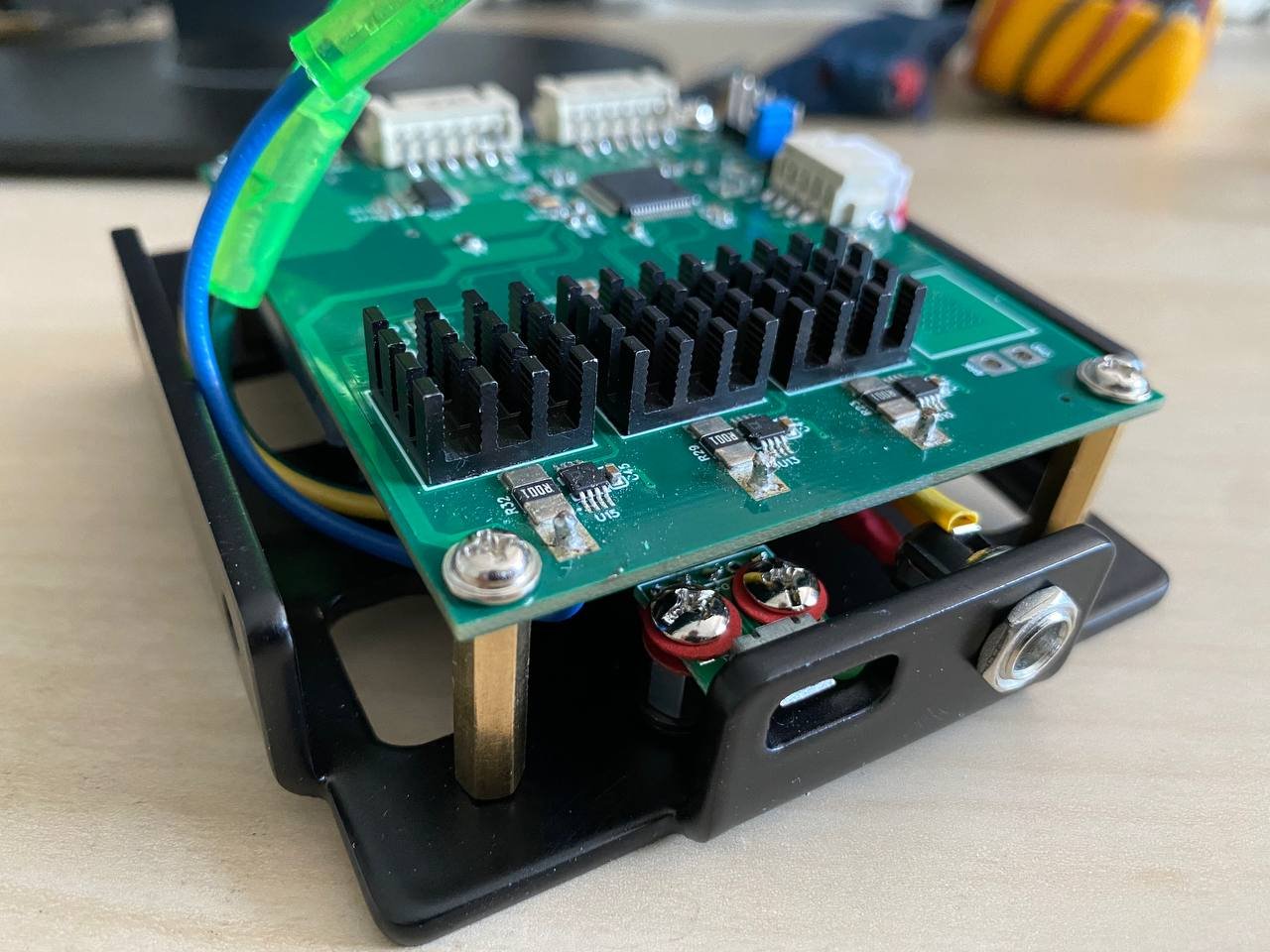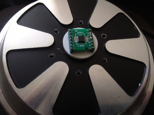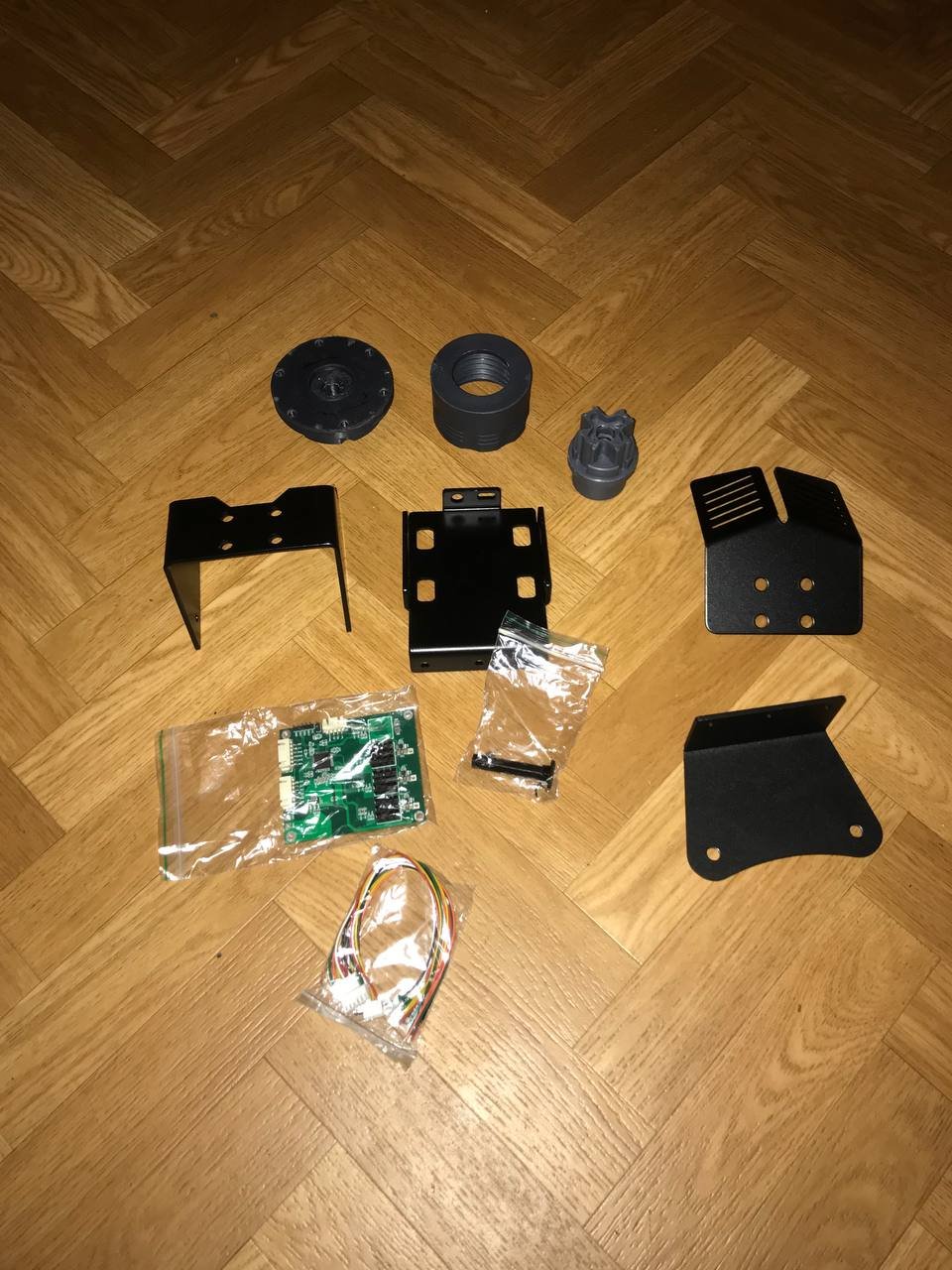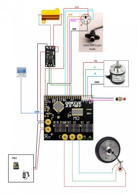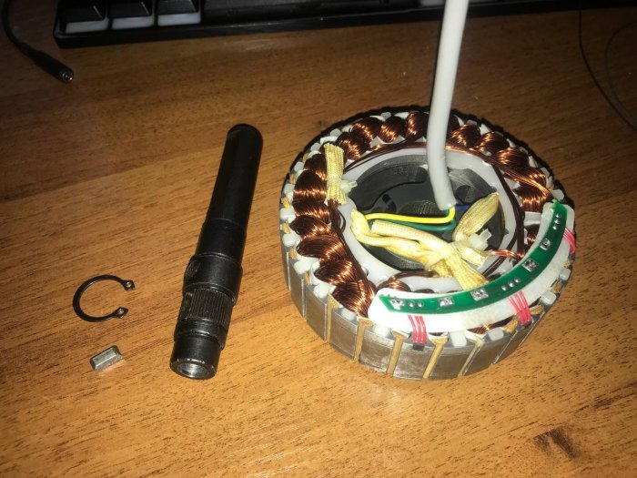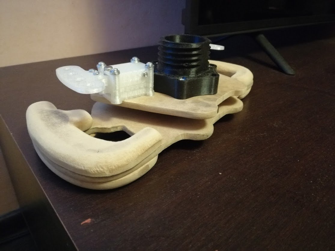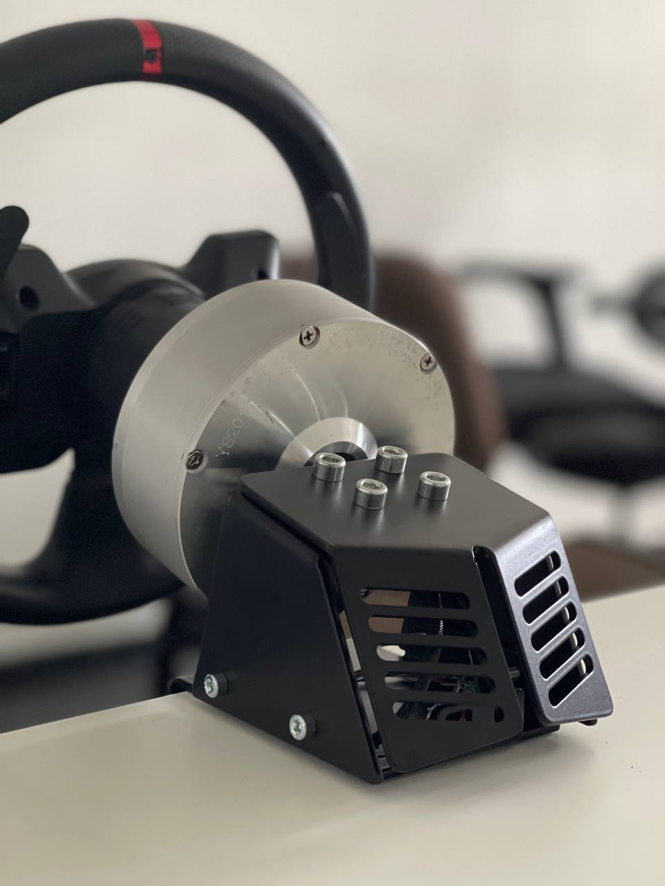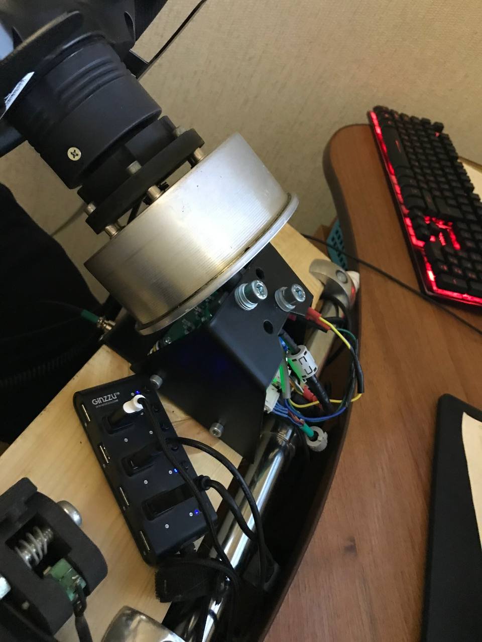 Доброго времени суток, товарищи. Я наконец таки дособрал базу по проекту @propeler. Я хочу выразить огромную благодарность @Koler и @propeler за их непосильную помощь в сборке данного проекта. Без них, я бы наверное забросил его в дальний угол и скорее всего так и не собрал бы. Что есть: Основная плата по проекту @propeler . Мне она досталась от товарища @Koler которая была распаяна и собрана им же Мотор от 6.5 гироскутера. магниты 25мм. Его я разобрал полностью: вытащил вал для того чтобы насквозь его просверлить. Сам корпус был проточен токарем, чтобы убрать рисунок с лицевой стороны. Стенка на лицевой стороне была тонкая для нарезания резьбы. В итоге взял алюминиевые резьбовые клепки и изнутри из установил. Энкодер абсолютный AS5048A. Крови попил он мне много. Первый энкодер я запорол тем что перегрел пятаки куда паяются провода. Качество плат оставляет желать лучшего и при малейшем перегреве пятак остается на проводе. В итоге один из проводов отвалился и я не заметив этого спалил стмку на плате. Устройство перестало определяться и сама СТМка грелась сразу так что палец держать невозможно было. После этого купил на авито дев плату с такой же стмкой и отдал ребятам, кто занимается ремонтом ноутбуков и телефонов, чтобы они на своей паяльной станции ее перепаяли. Пятак восстановить не получилось в итоге заказал другой энкодер. На втором энкодере случился тоже конфуз. Случайно задел один из конденсаторов на плате и в итоге оторванный пятак. Тут у меня получилось подпаяться к дорожке и восстановить пятак и вернуть конденсатор на место. Провод для энкодера - подошел обычный телефонный провод на 6 жил. Проводки тонкие и он как раз в оплетке. Крепление руля, адаптер, и кроштейн для закрепления энкодера мне также прислал @Koler Сам руль Т300RS. Штекер покупал в ЧипДип - MiniDin 6pin Спиральный провод покупал с доставкой из России у товарищей кто занимается ремонтом раций. Подключение к плате сделал из 2 частей. 1 часть идет от базы к стойке, где закреплен разъем резьбовой 5 пиновый. И на самой спиральке уже ответная часть. Сделал так чтобы провод к базе не дергался лишний раз. БП 19 вольт, 9.5 ампер от ноутбука. В итоге на этих выходных дособрал это все. Процесс затянулся месяца на 3, из за ожидания запчастей, иногда выгоранием самого себя из за того что не все получалось. Важно По результату полученной базой очень доволен, после G25 логитека это небо и земля. Где тестил: Assetto Corsa, Assetto Corsa Competizione, iRacing. Будет время попробую в других симуляторах. Эта троица подцепила руль без каких то танцев с бубном. Из нюансов, как в общении с @propeller решили что не хватает 4 бтнки (тормозного резистора) потому что в некоторых ситуациях из за сильного контр руления БП отправляется в защиту на 1-2 секунды. Случается это редко в обычных гонках, но если попробовать подрифтить то тут будет это часто. Так что ждем реализации тормозного резистора в прошивке Можно конечно взять БП помощнее и тогда будет запас. Вроде все, фотографии какие делал в процессе сборки приложу Видео тестов чуть позже. Вчера проехал часовую гонку и кайфанул. Реально на 45% мощности получилась гонка кроссфит, руки с непривычки болели По поводу ощущений - на руле стало ясно где снос передней оси, где блокировка колес, где снос задней оси. Я если честно не гуру в плане рулей, ездил только на г25 логитеке и на реальных тачках - сравнивать особо не с чем в пла