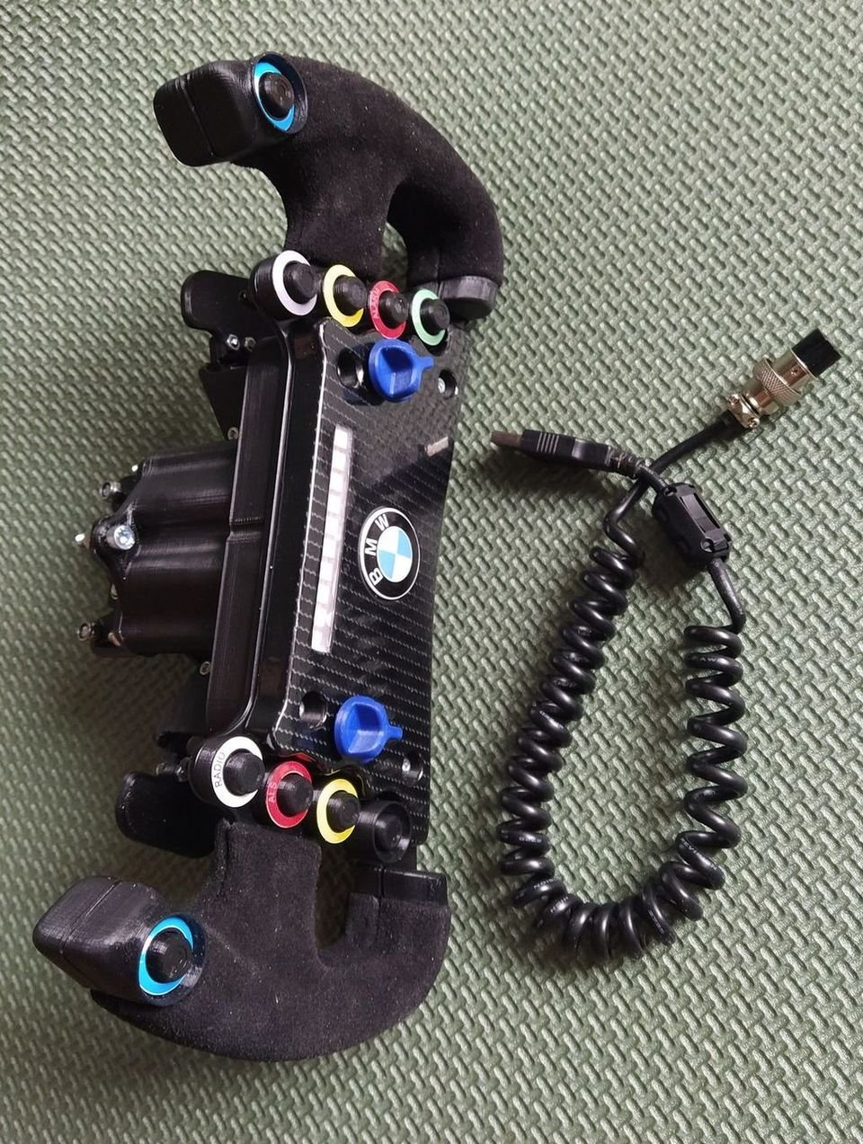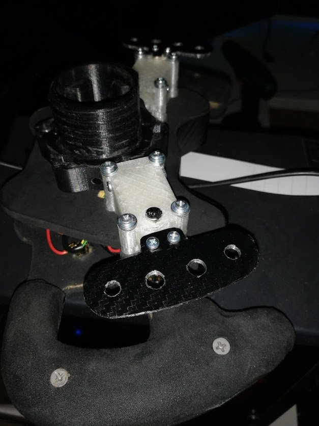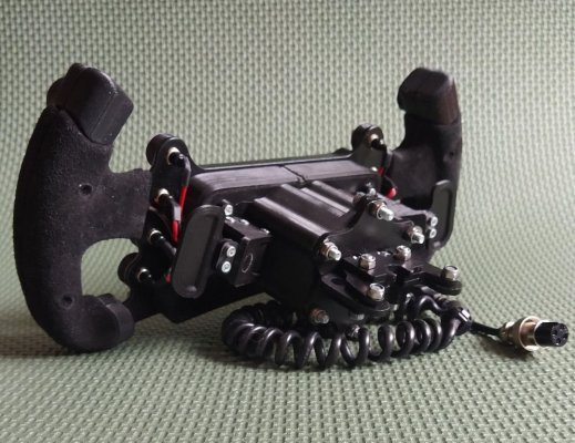 Всем привет, решил я создать отдельную тему под свой проект, перед началом я бы хотел выразить благодарность за технические консультации следующим пользователям портала: @Caravangoes @DarkGracius ну что, погнали! :) в поисках б/у коллекторного мотора постоянного тока типа MY1020 ну и "подобных", совершенно случайно наткнулся на Болгарский двигатель PIK-12 3/10-1 в состоянии почти нового, и после консультаций с @DarkGracius и изучении его темы на подобном моторе https://forum.simracing.su/topic/3830-narodnyy-directdrive-na-motorah-postoyannogo-toka/ был начат свой проект со своим видением прекрасного :) задняя крышка была просверлена для установки корпуса/держателя энкодера (omron 600 ppr) вал просверлен сверлом на 5мм, нарезана резьба м6, вкручена шпилька для соединения с муфтой энкодера, корпус/держатель энкодера напечатан на 3д принтере заменил штатные провода на мотор (использовал кабель КГхл 2х4мм) для крпеления мотора в гараже был найден "маленький" уголок 75х75х6 мм выпелен, просверлен и покрашен на вал мотора установлена 3д печатная быстросъемная муфта быстросъемная муфта представляет из себя разрезанное шлицевое соединение, сжимаемое зажимом-эксцентриком ну и для "+15 лошадей" мотор был обтянут пленкой под карбон на этот "настольная" часть была закончена от мотора идет жгут проводов (силовой кабель на мотор и экранированый кабель на энкодер) к блоку управления блок управления собран на МК STM32 и 2х BTS 7960 //тут меня сейчас закидают какашками, но я не подключал скрутку VCC+R_EN+L_EN к +5В - это дало эффект, что когда FFB=0 руль "абсолютно висит в воздухе" и вращается свободно без сопротивления, если же подать постоянное питание на эту скрутку, то обмотки мотора закорачиваются Н-мостами и не дают ему так свободно вращаться - еще раз повторюсь разница есть когда отсутвует выходный сигнал FFB// корпус блока так же напечатан на 3д принтере ] мощный блок питания был куплен у товарищей майнеров тока у него конечно с запасом... он сильно шумел вентилятором, и на скорую руку было сделано колхозное решение для уменьшения шума вентилятора, путем уменьшения его напряжения с 12 до 4 Вольт (сильно не смеяться) ] над коробкой с STM32 и BTS установил вентилятор чтобы вентилятор не работал постоянно, между ребер BTS вставил термостат KSD9700 с включением на 50 градусах ну и эта коробка установлена верхом на блоке питания спереди на коробке "clipping led" сзади разъем RJ45 для подключения энкодера и USB шнурок для подключения к ПК следом за коробкой поставил розетку РС-102 для подключения кабеля на мотор ну вроде пока все... если что забыл - спрашивайте замеры максимального момента (софт лок) дали усилие 10кг на рычаге 81мм (8,1 НМ) графики степ теста c баранкой (китай 320мм) и без: /руль после выключения FFB не останавливается т.к. как я говорил выше - мосты отключатся и он болтается несколько раз между софт локами/ график линейности усилия продолжение следует)10 баллов
