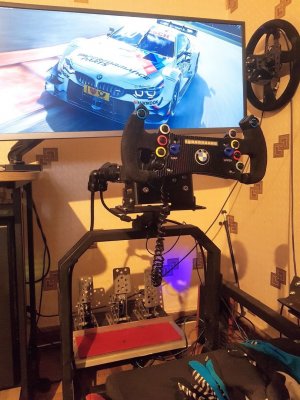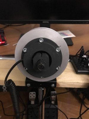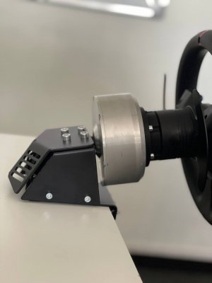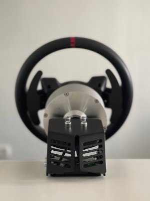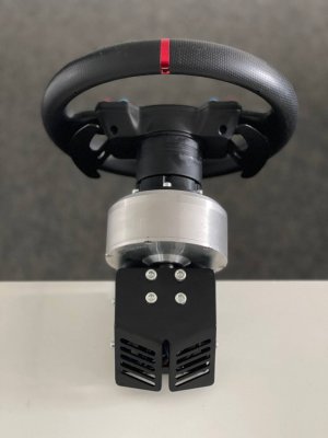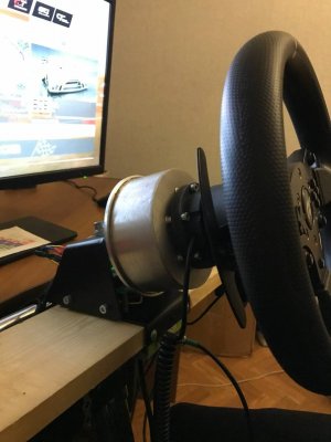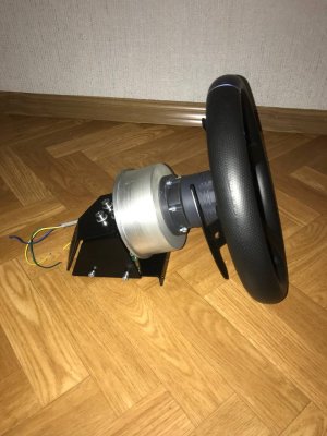 Вот и я собрал ДД на моторе PIK 12-3/10-3. Собирал по схеме Beg'а, только скрутку VCC+LEN+REN я решил запитать. В качестве блока питания использовал блок для светодиодов на 12В 50А. BTS пришли на GAC913, для надежности установил две штуки. Все заработало, если не считать бракованной STMки. Пришлось раскошелиться и купить у спекулянтов, чтобы не ждать еще месяц посылки из Китая. Энкодер установил на напечатанный П-образный крепеж. Электронная начинка была засунута в контейнер с установленными разъемами для питания и энкодера. Т.к. на своих рулях я использую автомобильный квикрелиз, то соответственно на вал закрепил переходник, для чего использовал идеально подходящий по диаметру водопроводный сгон. Для надежности крепления сделал в стенке 2 отверстия с резьбой и зафиксировал всё на винты. Вчера провел испытания, играл в Рфактор2 и АЦЦ с обеда и до полуночи. Выставил значение силы на 100, но потом убавил до 85. После DFGT тяжело крутить на 100%. Частоту PWM поставил 8кгц. По итогу: движок нагрелся наверно градусов до 40-50 (по ощущениям значительно холоднее полотенцесушителя, который по регламенту 60-75 градусов), бтски чуть теплые, блок питания в контейнере не нагрелся. С Рфактором возникла странная проблема зеркального форсфидбека, пришлось в controller.json изменить значение FFB на отрицательное. Движком доволен, получилась отличная база. При нынешних ценах, за стоимость Т300, можно собрать гораздо лучший девайс с баранкой и педалями.14 баллов
