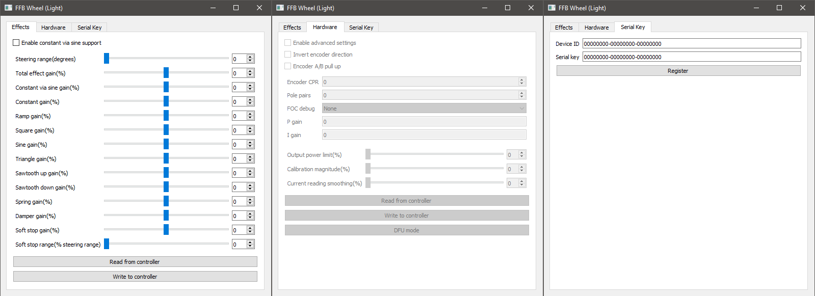 По настройкам Enable constant via sine - включает поддержку еффектов по принципу как их шлет Raceroom. Пока я встречал только в одной игре. Для всего кроме рейсрум лучше снимать. Steering range - думаю без вопросов. Дальше все с припиской gain - это настройка силы отдельных эффектов. Все что в плюс крутит в одну сторону все что в минус - в другую. Damper не реализован на данный момент, Total - общий масштаб усилия который накладывается на все сразу. Если нужно инвертировать все еффекты достаточно инвертировать Total. Soft stop range - расстояние в процентах от Steering range на котором нарастает усилие упоров в конце диапазона. Значения вывода оси джойстика при этом на этом диапазоне уже стоят в максимуме Вкладка Hardware неактивна пока не введен Serial Key для конкретного Device ID. Когда правильный ключик введен и нажата кнопка Register программа переходит в полный режим и на вкладке Hardware становиться доступна кнопка Enable advanced settings. (известный баг - ключ не сохраняется между перезапусками контролера - работаю над этим) Кнопка Enable advanced settings добавлена чтоб случайно не поменять что не надо. По хорошему все на этой вкладке надо настроить только раз и забыть. Invert encoder direction - меняет направление вывода энкодера. Делает то же самое что смена подключение выводов A и B к контролеру. Я предпочитаю чтоб при повороте руля по часовой значения по оси увеличивались. A/B pullup - ставить для енкодеров которым нужна подтяжка выводов к питанию. Большинство енкодеров по типу боченков Omron, но смотрите по инструкции к енкодеру надо или нет. Encoder CPR - суммарный CPR энкодера, с учетом редукции(если есть) PPR * 4 * отношениередукции Pole pairs - количество пар магнитов мотора. У ховербордного мотора в большинстве случаев их 15 FOC debug - вывод по двум осям парных параметров FOC алгоритма. Полезно при настройке параметров P Gain / I Gain. Поставить в None для обычного использования. Я обновил прошивку чтоб None было по дефолту. P Gain / I Gain - параметры алгоритма FOC. Их настройка отдельный вопрос, надо писать отдельный пост с картинками. туда же Constant reading smoothing. Параметры важные от них зависит "шумность" и точность алгоритма, но не простые в настройке. Будет отдельно по ним. Output power - общая мощность в процентах от физически возможной. Начинайте с низких значений и повышайте по чуть чуть пока мотор сохраняет стабильность и не перегревается. Кнопки - прочитать что записано в контролере - записать в контролер. На каждой вкладке свои. Изменения на вкладке еффектов сохраняются отдельно вкладки hardware.11 баллов