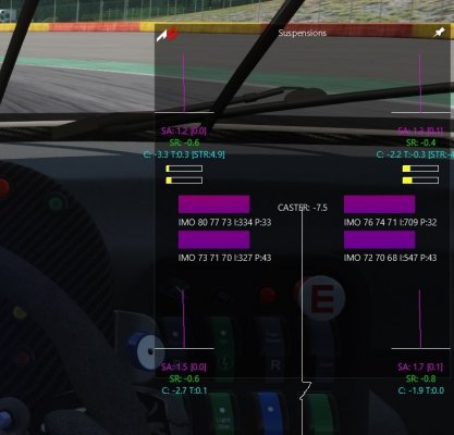Не на всех прямых задние шины в корсе начинают резко набирать температуру. Из того что я заметил: в спа после оруж, в монце на последней прямой после параболики. Да и вообще какой перегрев, на валелунге хрен прогреешь шины на дефолте, в спа в одном месте какое то незначительное превышение на стандартных(!) настройках