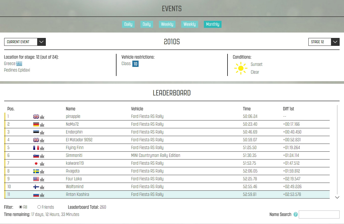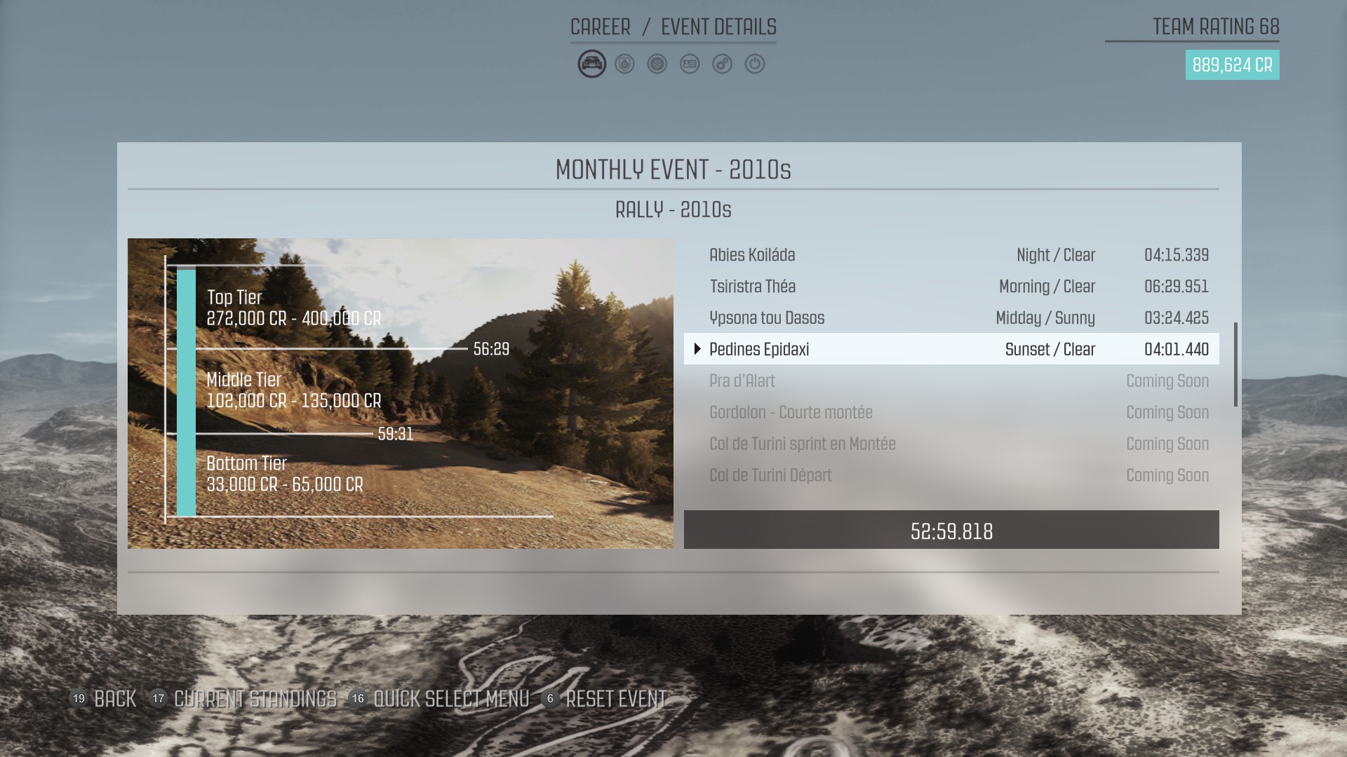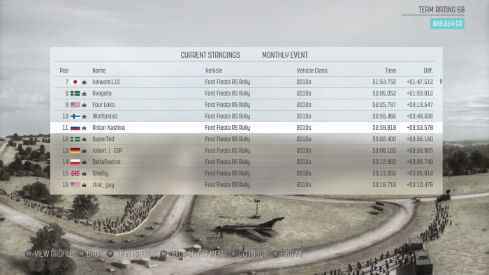 Решил проехать месячное событие, в надежде получить около 400 000 кредитов. Только как-то странно добавляют новые спецучастки: не в начале недели, а как-то в середине. Пока моя планка после 2-х этапов держится в районе 390 000 - 400 000 кредитов. 11 позиция, но разница с лидером почти 3 минуты. Еще впереди 2 этапа (Монте-Карло и Германия). Кто-нибудь участвует в этом событии?