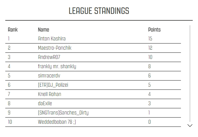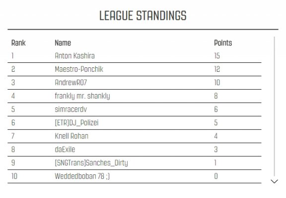 Мне абсолютно всё равно во что играет человек. И я абсолютно уверен, что никто из них больше не поедет в Лиге. Поэтому их стоит исключить. А здесь, хоть и виртуальный, но всё же чемпионат и тут не должно такого быть: хочу еду, а хочу и не еду. Если человек не может поехать по каким-либо причинам, то об этом стоит предупреждать. Я принимал участие в чемпионате GT3 в PCARS и получалось так, что я не мог присутствовать на самой гонке и я об этом предупреждал организаторов. У них и в регламенте так было: два пропуска без предупрежденя - из чемпионата долой. А нам 10-15 человек для начала вполне хватит.