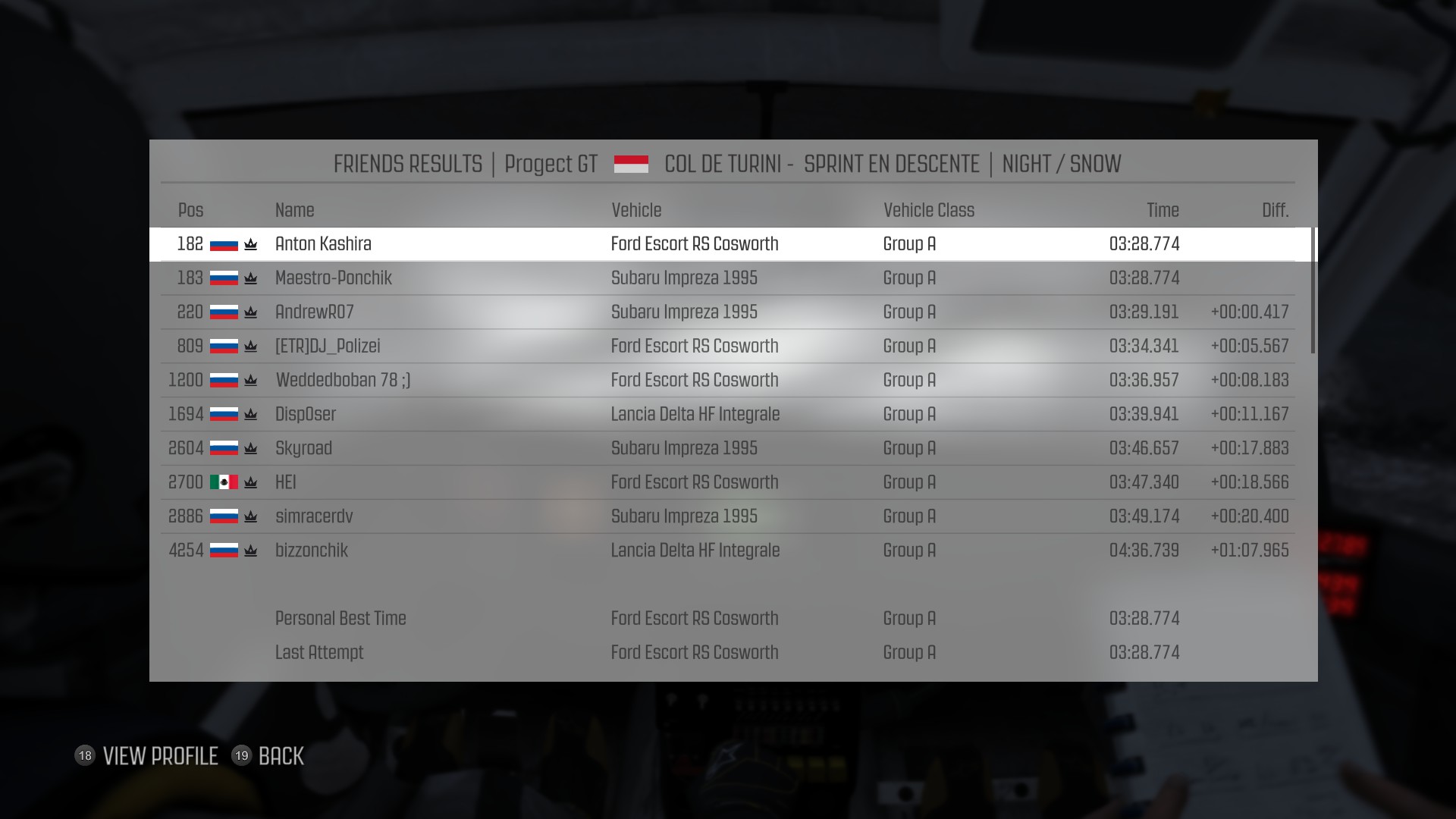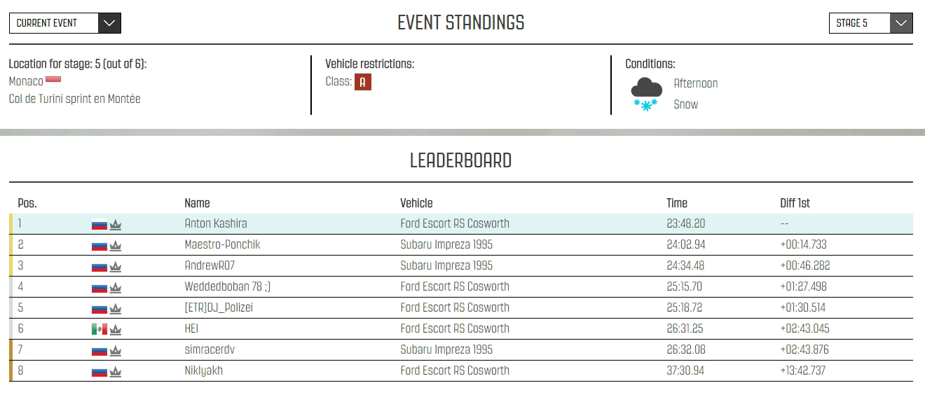 Проехал шестой спецучасток на этапе Монте-Карло и удивился одинаковому времени в таблице друзей и в таблице лиги отрыв не изменился с пятого по шестой спецучасток. Борьба серьезная была на этот раз.