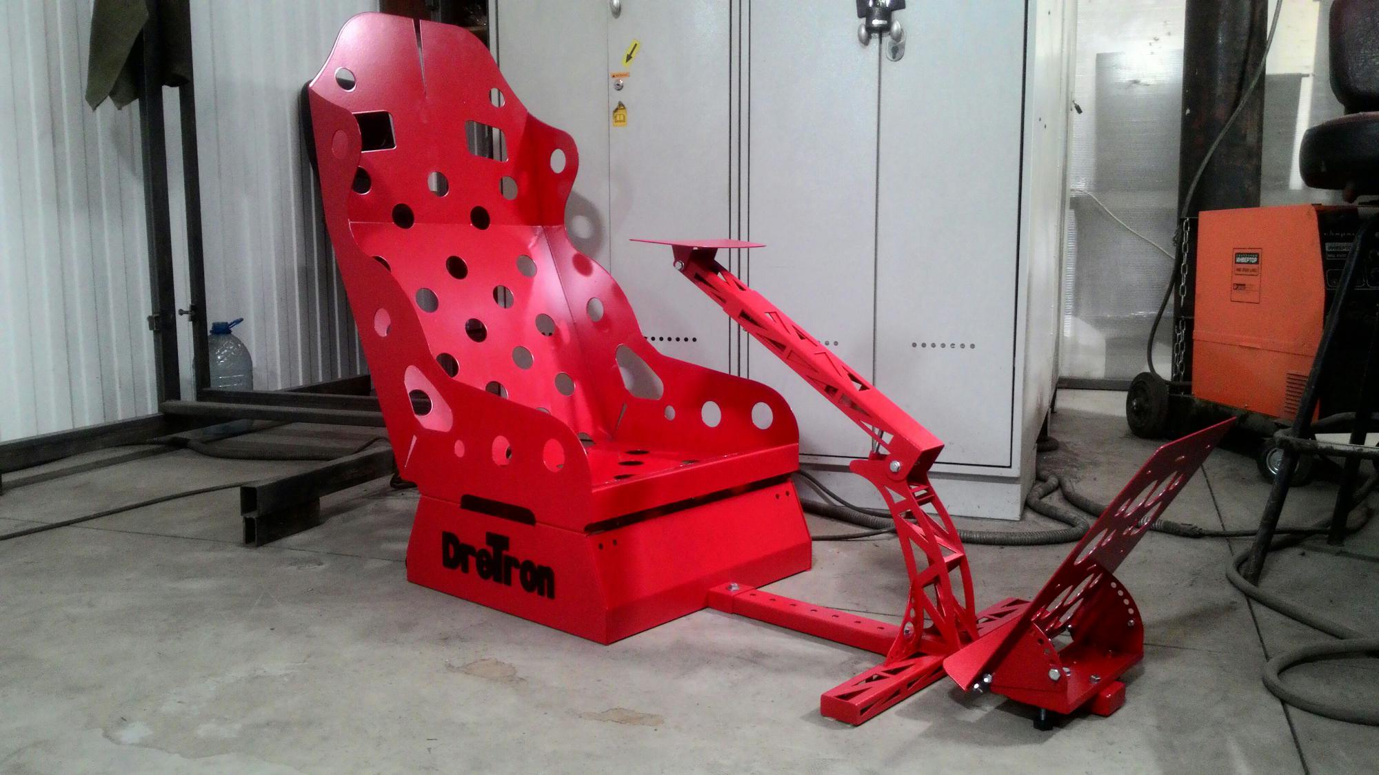 6. Кресло для симрейсинга DreTron в цветах Феррари ! цена 25000,множество регулировок,для удобной посадки руль поднимается,есть задние колеса для перемещения,ничего не люфтит руль не шатается,единственный минус не обтянуто кресло. Есть крепление для кпп и подставка под напитки слева