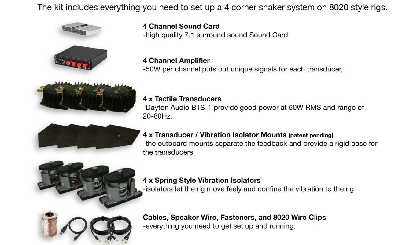 Начал бы с простого и расписал бы хотя бы сами динамики, о чём написано на сайте. Не то давай разберёмся, а сам скинул видео и всё) Обычные Bass Shakers, которых куча на али и есть куча роликов на ру ютубе и форумах, кто какие заказывал и с каким усилителем. На сайте указаны ориги проекта - Dayton Audio BTS-1 Усилок можно найти даже сразу с интегрированной аудиокартой на 2.0, просто взять 2шт USB Пружины тут в качестве виброразвязки, чтобы вибрация сохранялась в кокпите, а не рассеивалась в полу, о чём написано на сайте. Вещь индивидуальная под каждый вес кокпита и человека. Они даже разные используют. Вот где заказать один размер с разной силой уже хороший вопрос. Взял бы пару на 50кг под задницу, и по меньше под перед. Чуть переделать конструкцию не проблема от таких готовых с али https://aliexpress.ru/item/1005003735032958.html https://aliexpress.ru/item/1005004447537587.html (тут даже можно попытаться по таблице в описании поискать более конкретные) Чаще в подобных проектах используют даже резиновые виброизоляторы, которые по проще как по мне использовать, но хороший вопрос в эффективности https://tula.vseinstrumenti.ru/krepezh/furnitura/promyshlennaya/vibroizolyatory/
