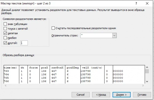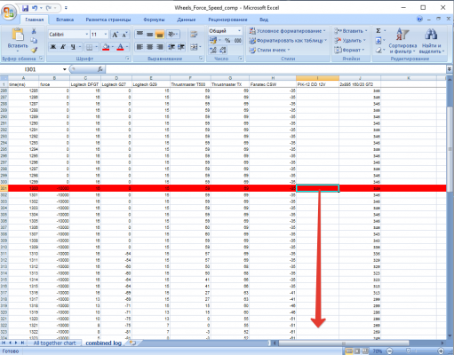 @Basma4 в видео услышал вопрос по поводу графиков) 1. проводим тест на стандартных настройках wheelcheck "step Log (step test)" 2.в папке "документы" в винде появится csv лог файл с названием типа log 2020-06-29 22-01-48.csv 3. открываем excel, раздел данные - из текста, и выбираем свой csv файл в проводнике формат данных - с разделителями, далее - символом разделителем является запятая и другой (там ставим точку) далее/готово -вставляем данные на лист дальше надо скопировать столбец "D" до конца с того места, как в столбце "С" появилось (-10000) дальше надо взять файл https://yadi.sk/i/hTVH80JPDfdstQ в нем вставляем начиная от сюда и ниже наши значения а выше - можно просто растянуть сколько там было до этого к примеру у меня было "129" - значит растянем "129" и если мы все сделали правильно, то тут должен появиться график с названием из верхней строки P.S.: особое внимание следует обратить на исходный csv файл, у меня были баги - когда время начинало сбоить и пропускались строки лога т.е. в импортированном csv логе должно быть около 2000 строк +/-