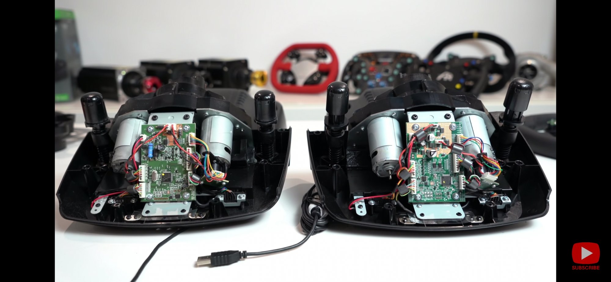 @Beg вот тут слева g29, справа g923(xbox версия). Вроде бы количество проводов, сами провода и разъёмы одинаковые. Различия между рулями только в плате(существенные), а разница в цене неплохая такая. Надо дождаться, когда начнут платы продавать( хотя, думаю, это не скоро будет), а там видно будет.)