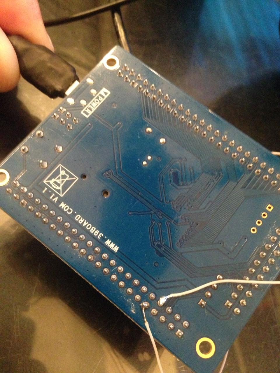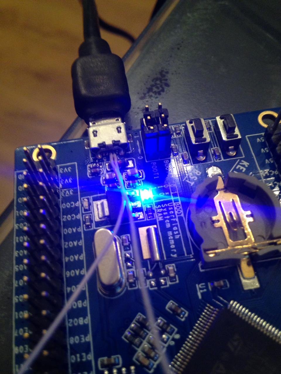 В кратце: Из схемы выше видно, ( да и кто работал с STM знают ), что в этих чипах есть собственный юсб контроллер, который работает без посредников ( PLок и FTшек ) который позволяет работать с STшками на прямую ( но не полностью ). Соответственно - если черная плата и дисковери шьётся на прямую по юсб, то она использует именно этот встроенный юсб ( ну нет на черной плате доп. контроллеров ) По схеме выше видно распиновку с номерами ног. Найти схему не составляет труда - очки в помощь :) Так как питание моей платы осуществляется ( по задумке китаез ) и через юсб тоже то условно + и GND у нас уже есть, осталось подтянуть дату+ и дату -. На схеме выше видно что для проброса используются резисторы с номиналом 0 ом - то есть их нет :) Вот и два провода от юсб разъема до пинов PA11 и РА12 моей платы ( вызваниваются мультиметром на самом чипе ) коими и являются выводы самого чипа с ногами 33 и 32. Вроде все очень просто.