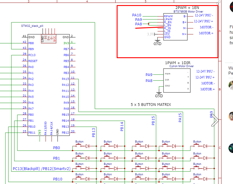 Занесу в тему информации по EMC 1.0.4 (платная, не lite) на stm32f103c8t6. Выше подмечали, что на MMOS при запайке 5в/r_en/l_en руль начинает туже крутится в простое (будто обмотки в кз). На EMC на эти контакты не подкидываются 5в напрямую - на них идет контакт A8 стм-ки: И нет такого эффекта, как на EMC - отрубаю все эффекты и руль крутится так, будто обмотки не закорочены\напряжение на них не подается (легко и быстро). Причем, на EMC без подключения к контакту A8 bts вообще не работает (почему? хз)