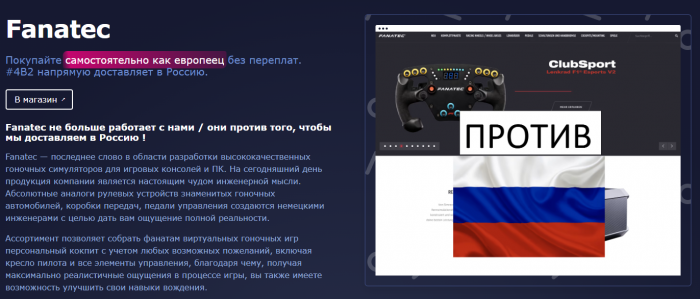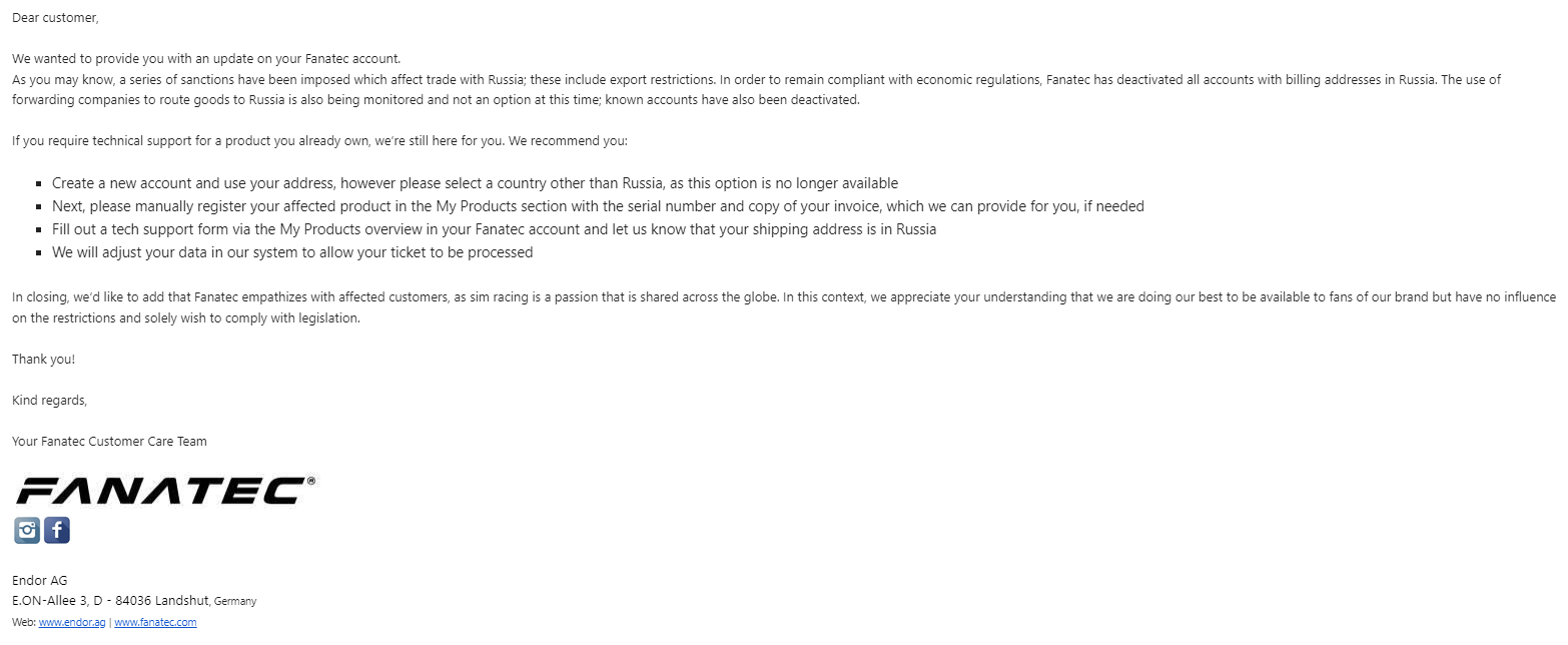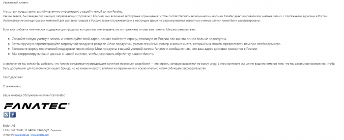 "Заполните форму технической поддержки через обзор Мои продукты в вашей учетной записи Fanatec и сообщите нам, что ваш адрес доставки находится в России."
