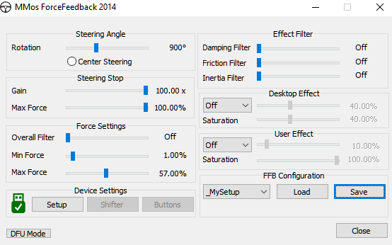 Перепрошить я не смог - STM Flash Loader не видел плату. Провозился час, плюнул, переставил перемычку Boot0 обратно на землю, запустил MMosForceFeedback и тут внезапно она увидела плату, все сама подгрузила со всеми частотами и CPR и тп. Конфиги стали нормально сохраняться-подгружаться, короче, магия. Для себя я сделал вывод, что при любых проблемах с базой, надо возвращаться на шаг назад и все нудно перепроверять по нескольку раз. Но почему Flash Loader не увидел, конечно, интересно. Тесты WheelCheck отрабатывает корректно, не спит, не глючит, как это было ранее. Надо будет сгенерить LUT-график. В игре начал с силы в 30% MMos (50% в игре), довел до 66% MMos (100% в игре) - все четко работает, ничего не вылетает, FFB не пропадает. БТС-ки немного теплые, мотор холодный. Gain пока не трогал, стоит на 2x. Кстати, это некий мультипликатор силы FFB, правильно я понимаю? Выставлять его по ощущениям? Уже сейчас ощущения в игре однозначно лучше, на мой взгляд, чем давал G29. Пока повкатываю так, покручу параметры FFB, а через пару-тройку недель потестирую передаточное в 1:5.