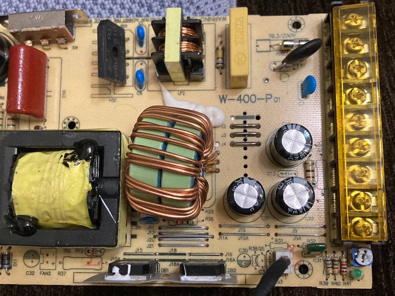 Ребят, куда именно на блок питания накинуть конденсатор, чтобы он в защиту не уходил (при силе более 50%)? Подскажите, пожалуйста. Хочу попробовать этот вариант, прежде чем другой БП покупать. Схему на свой БП не нашел, поэтому только фото.