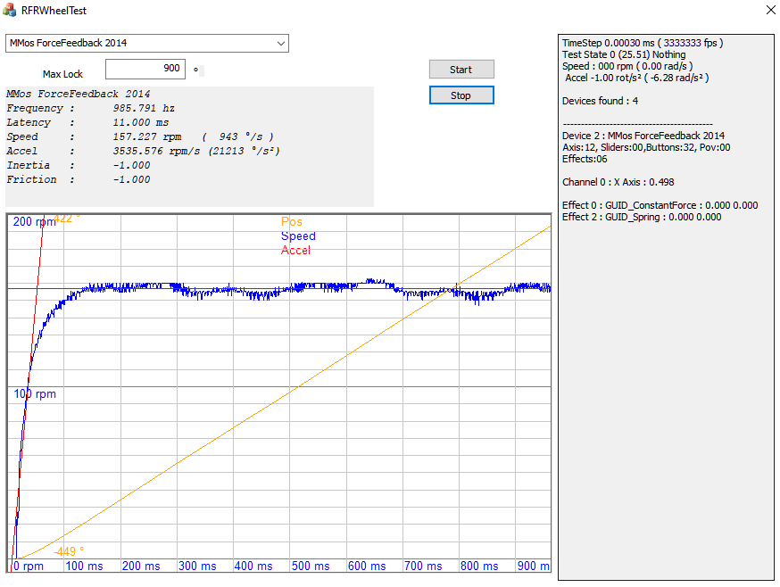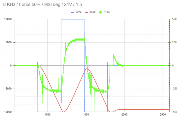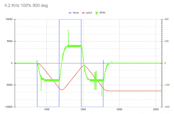Всем привет. Дошли руки покатать и поковыряться в своей поделке (ременная база на таком двигле и бп 12V/32A/400W). Руль по моим ощущениям на 1:5 и 1:6 довольно тяжелый и неинформативный. Поставил 1:3 и в целом силушки мотора мне хватило на 100% в MMos и 80% в игре, но информативность не огонь. Построил график Step Test. Тут обратил внимание, что WheelCheck выдает параметр velX (rad/s), подумал, что из этого можно узнать RPM, умножив значения на 9,5493. Получилась такая штука (тут, конечно, стоило сгладить данные): Вопрос первый - это корректное предположение и такой вот расчет RPM? Вопрос второй - если это корректно, то получается примерно 156 RPM на руле, что маловато на полсотни оборотов. И тогда, как можно это скорректировать и дотянуть до 200+ для большей информативности на руле? Редукцией, питанием или это все хрень и лучше поискать другой двигатель? Буду очень благодарен советам и мнениям.