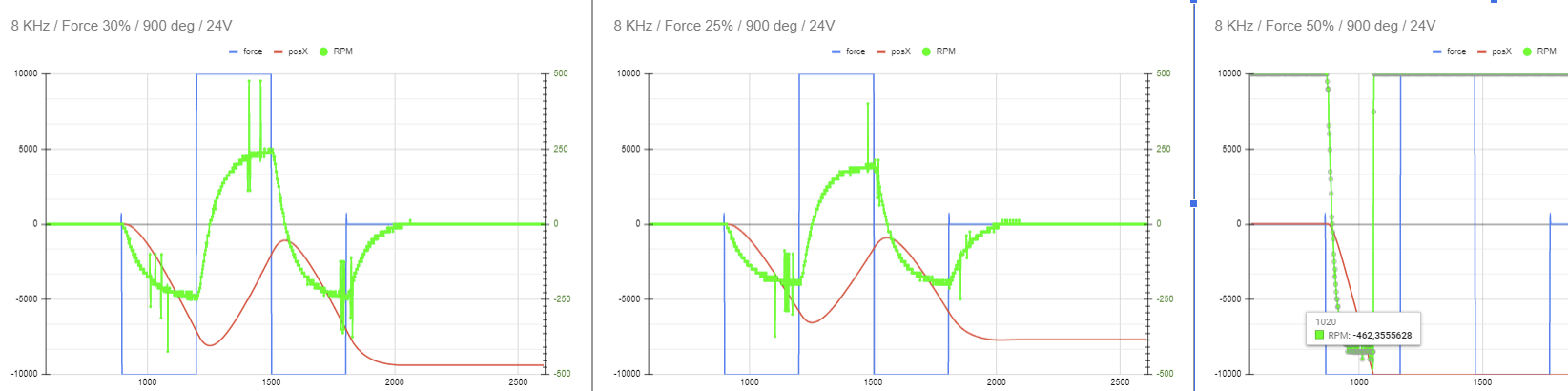 Затестил с БП 24V/20,8A/500W. Проверить WheelCheck'ами получается только до 35% силы - больше 35 бп уходит в защиту в момент изменения направления вращения. Получил такие вот картинки: При значениях силы получил такой, уже более интересный, RPM (подтверждается и с RFRWheelTest): 25% ~194 30% ~246 50% ~456 (но тут хз, тк ушло в защиту) Если я правильно понимаю, то более выраженная пологость графика RPM, говорит, что по крайней мере до 50% силы с БП на 24V получается чуть меньше момента в сравнении с 12V более крутым графиком. Поправьте, если ошибаюсь. Теперь в игре. При 30% MMos, в игре выставил 80-100% FFB и получил очень легкий и информативный руль. Субъективно: ушла вязкость, появилось много прозрачности, легкости, однако на поребриках руль довольно мощно пинался, точечно отрабатывая детали. Играть можно, но в целом силы не хватает. Стало похоже на G29, только более сильный и более информативный . Я попробовал 35%, уже получше, но при резкой перекладке бп уходит в защиту. Опять же по ощущениям, полагаю, что мне бы хватило 40-50% силы на руле (при 80-100 в игре). Теперь буду думать, как решать вопрос с защитой бп до 50%. Думаю, что также может выплыть проблема перегрева (на 12V и 100% мотор за 20 минут нормально так грелся примерно до 55+ градусов), но это буду решать своим чередом, если разберусь с питанием. Ну и конечно буду очень благодарен советам и мнениям.