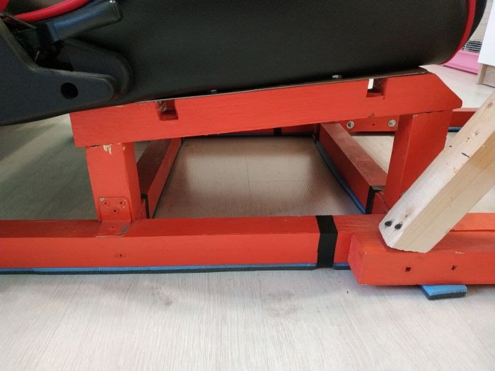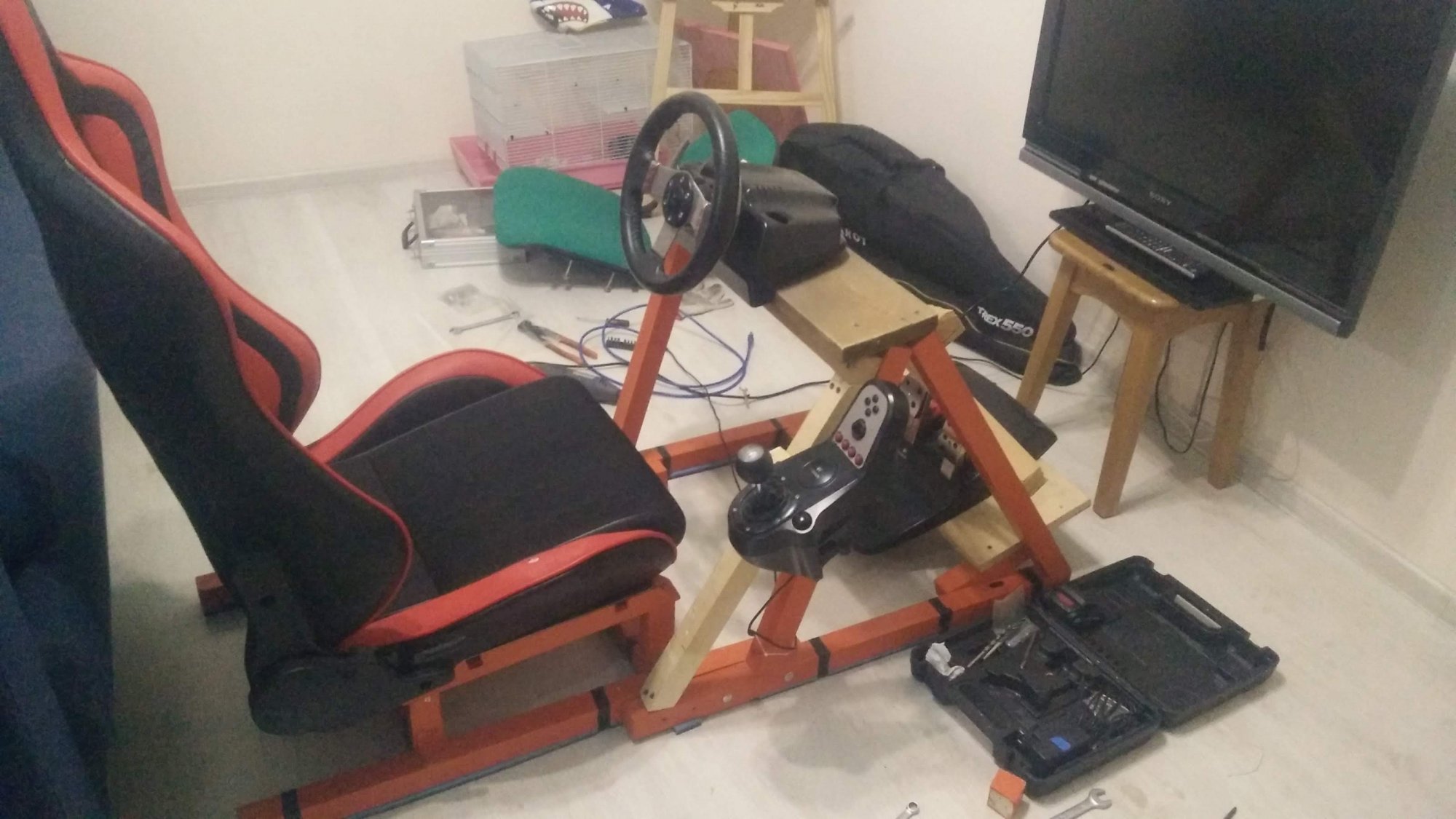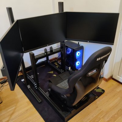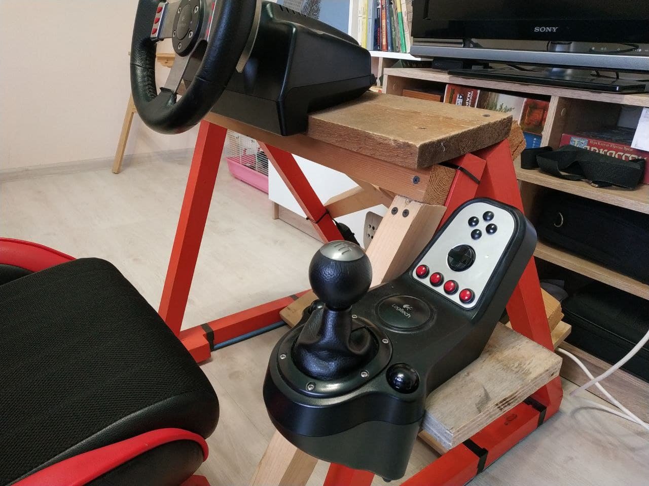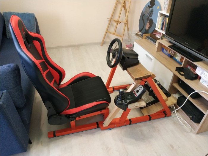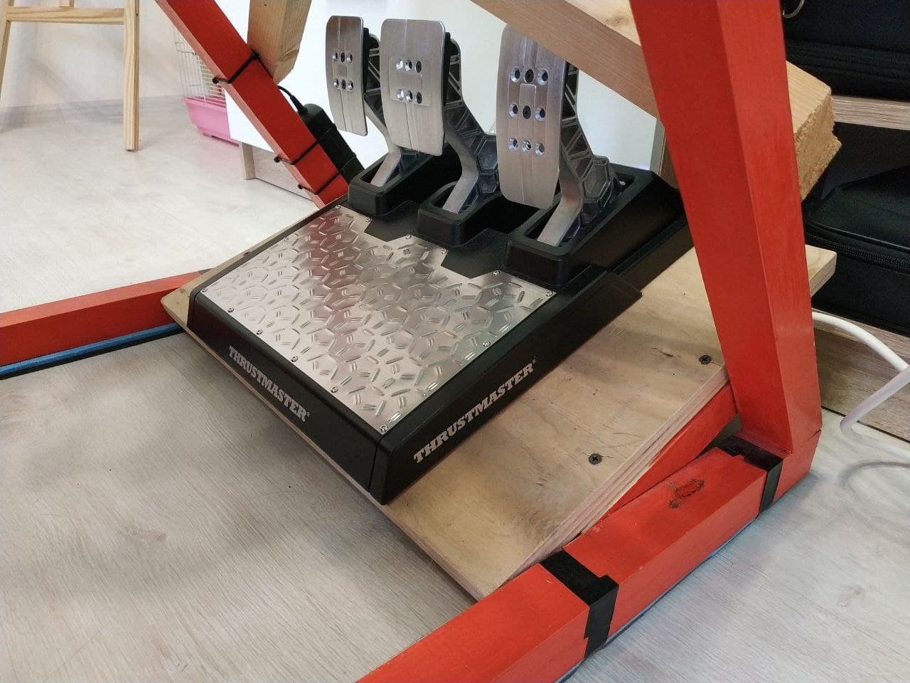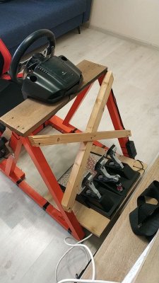 Накину в тему дешёвых решений фотографии своего кокпита. (когда-то уже постил фотки, но захотелось ещё раз ). Брус 40х40. Фанера 20мм. Под рулём какаято доска из деревенских обрезков. Юзаю уже 4-й год. Поначалу руль немного гулял - докупил брусок и сделал крестовину спереди. После этого всё по моим ощущениям достаточно жёстко стоит. Раз в полгода подкручиваю болты. Месяц назад поменял педали с родных G27 на Thrustmaster T-LCM. В приложении откалиброваны на BRAKE FORCE = 80. Пружины стоят чёрная и красная. Кокпит не разваливается. Гоняю в основном в ACC. Иногда по фану в Dirt Rally 2.0 бывает. Не топлю за свой кокпит, но для бичей людей, которые считают денежки, мне кажется, что подойдёт. Другое дело, что телек слишком далеко от руля стоит и маленький, но это совсем другая история.
