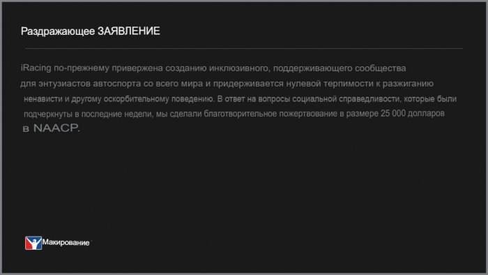 Они не бояться, они следуют тренду, у них есть их хозяева. Это Американское общество, здесь справедливости, логики и здравого смысла искать бесполезно. Сегодня их хозяева приказывают им бороться с дискриминацией по расовому признаку, заявлять о недопустимости дискриминации в отношении кого либо, а завтра рубильник переключается и те, кто вчера был борцуном с расизмом, теперь бегут роняя кал бороться с русскими. На разного рода компании, в том числе и iR идет давление со стороны крупных корпораций, типа Блекрок - диктующие всему миру, как им жить и чем дышать. Просто ты только сейчас столкнулся с так называемой "Американской дермократией" на своей шкуре. А я напомню, что еще пару лет назад, сервис iRacing жертвовал 25.000 зелени в поддержку нигерам из BLM, который удачно соскамился, обогатив черномазые задницы их идеологов, хотя изначально было очевидно, что это искусственно раздуваемый тренд. После чего началась борьба с конфедератами и поиски несуществующих расистов при раскрашивании машин. Теперь вот добрались до русских, которые просто безобидно играют в игрушки и никого не трогают. iR полностью зависимы от своих хозяев и неукоснительно следуют заданному, искусственному тренду. Тут важно другое, если уж в начале 23-го года iRacing и прочие мелкие конторки разродились на подобного рода санкции в отношении РФ, значит Блекроки собрались играть в долгую и события по взятию Бастилии как минимум до конца 23-го, а то и 24-го года не закончатся.