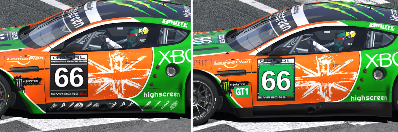 С декалями от iRacing, которые подгружает TP и которые полностью закрывают юбку и окрашивают номера в зеленый цвет, машины смотрятся ужасно. Я бы предложил организаторам рассмотреть возможность создания собственного стиля официальных наклеек, к примеру с черными номерными рамками для всех, так Астон по серьезнее смотрится. Но, чтобы они были черные у всех, надо в ручную устанавливать пакет текстур со всеми раскрасками.