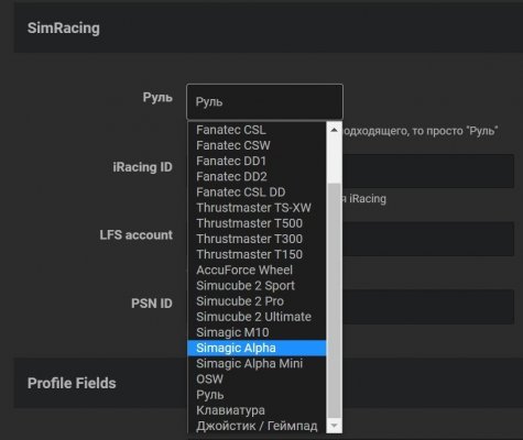 3. В профиле есть поле Руль. Там есть Simagic Alpha и Simagic Mini. А Simagic Alpha U - нет. Добавьте пожалуйста. Может ещё каких-то современных рулей нет. Хорошо бы проверить и обновить список.
