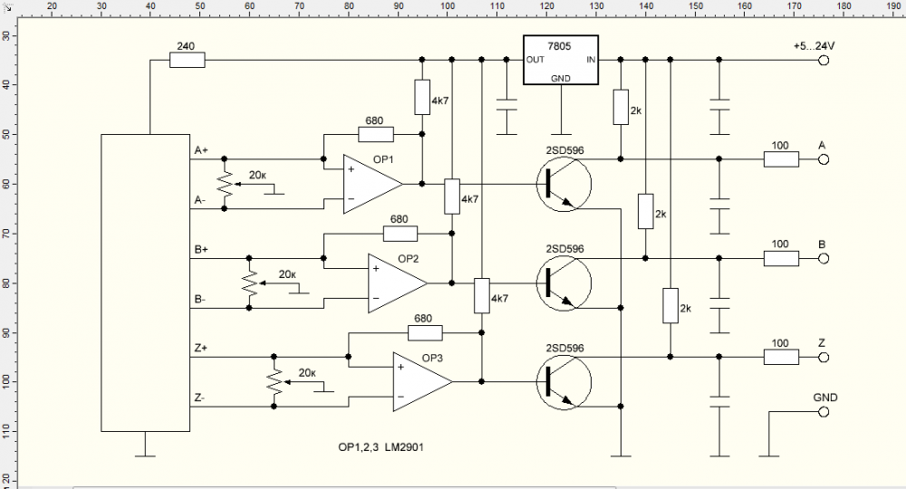 Схемы так и не нашёл, только общие по работе энкодера, в нете их на каждом сайте. Могу на пальцах объяснить. V4, V3, V2 это транзисторы, они открываются когда есть сигнал с микрухи и выдают напругу на выхода А В С, сопротивление выхода у меня с другой стороны 47 Ом. Микруха типа усилка, на неё приходит + и - с сенсора, а выход на транзисторы. не стой стороны начал))) вокруг микрухи всё подтяжки входов и выходов к питанию. А подстоечные резисторы на 20 кОм, для подтяжки выходов + и - с сенсора на землю. Ими подгонял длинну импульсов, это самое главное, они должны быть одной длины, что А, что В, это осцилографом. С даже не трогал. Таких маленьких не нашлось, подстроил тем что было, замерил каждое сопротивление и впаял набором резисторов, вышло примерно пополам, с небольшим перекосом. Как то так)))