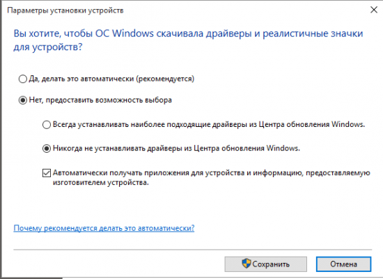 Я сделал следующее: идем в панель управления и открываем там аплет "Устройства и принтеры" и выделяем наш компьютер, затем или правой кнопкой мыши или нажимаем в меню "Файл" и выбираем "Параметры установки устройств" и там уже можно что то изменить на свое усмотрение