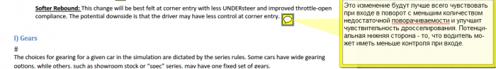 И еще: обратимся в конце-концов к руководству iRacing Car Setup Guid. Вот что они пишут и перевод ПРОМТа про задний медленный отбой (тем, кому не хватает иногда поворачиваемости)