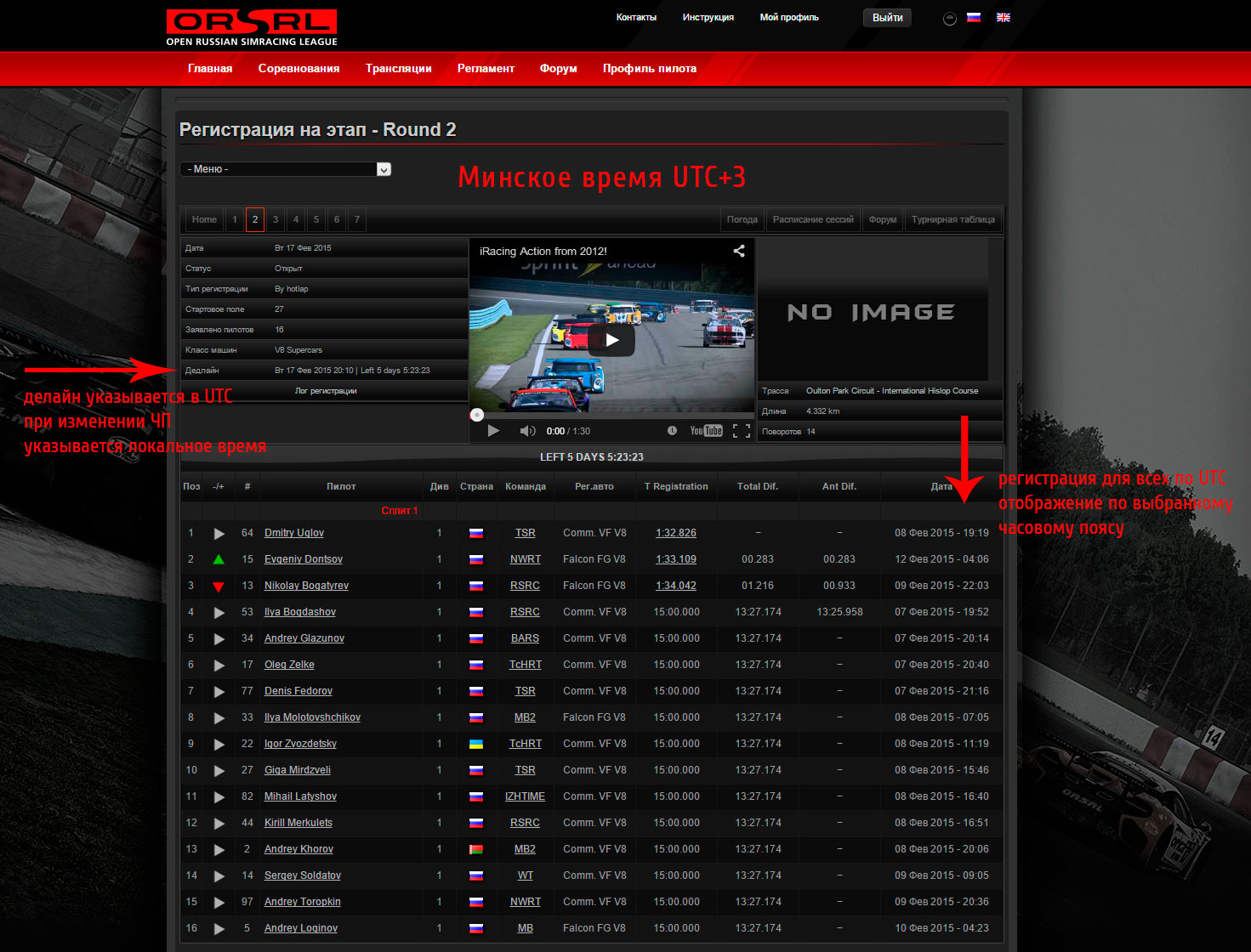 VeTeR Опубликовано 12 февраля, 2015 Поделиться Опубликовано 12 февраля, 2015 Теперь все даты в расписании указываются по всемирному времени. Если в своем профиле на сайте чемпионата ничего не меняли, то расписание так и будет отображаться в UTC. При изменении часового пояса, расписание времени сессий изменится соответственно. Расписание сессий UTC Расписание сессий - часовой пояс Калининград - Минск (Московское время все еще UTC+4, у меня и в винде часовой пояс Калининград +3) Делайн и время регистрации участников Осталась известная проблема с таймером, работает он правильно только при одинаковом часовом поясе на сайте и вашем пк. В целом ни на что не влияет, только индикатор. 2 Ссылка на комментарий