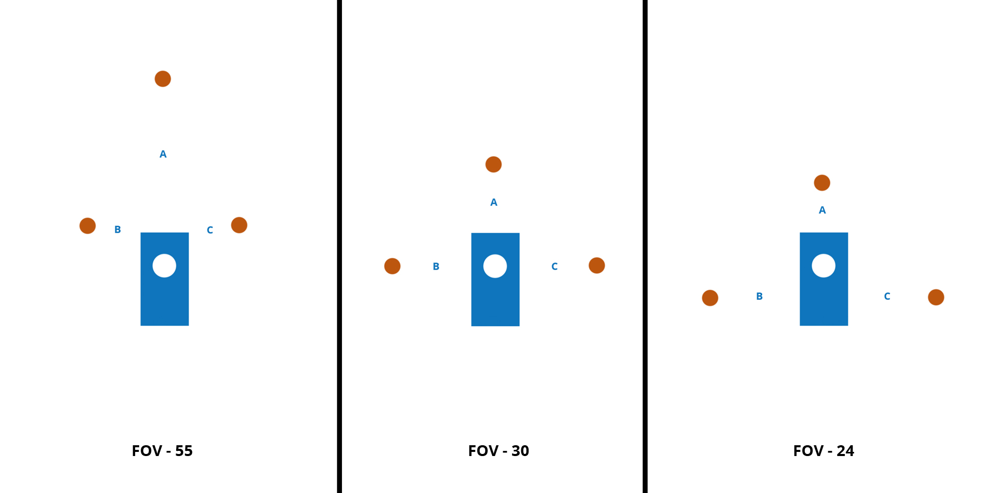 Если ФОВ 24, как советует калькулятор, это правая картинка, то получается обратная ситуация. Расстояние А мне кажется меньше, чем B и C. Оно мне кажется слишком коротким - объект А слишком близко находится.