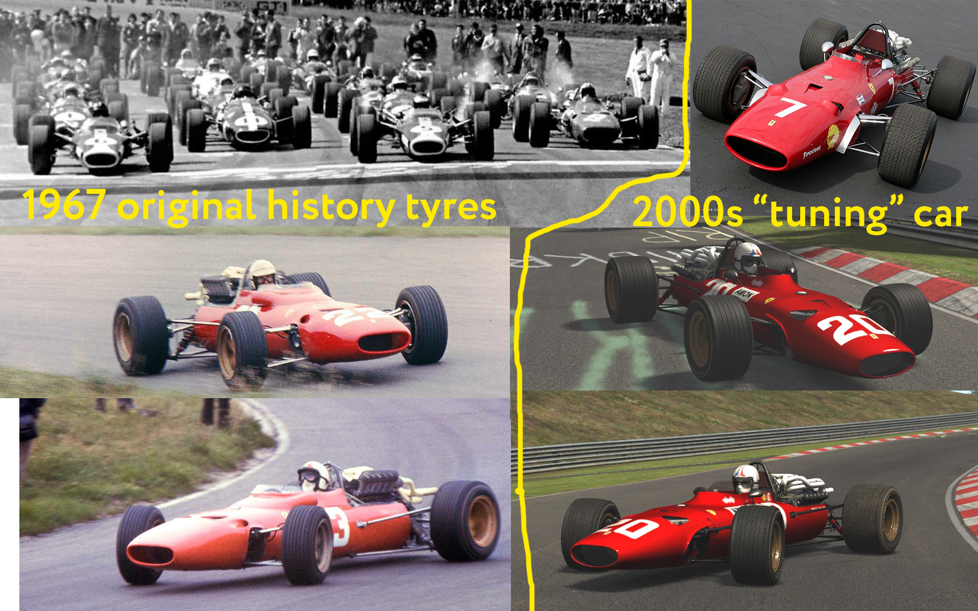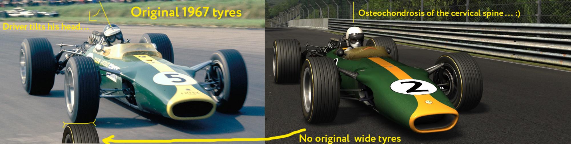 GranDoxin Опубликовано 20 сентября, 2017 Поделиться Опубликовано 20 сентября, 2017 Так ведь анимация совпадает с физическими векторами... То есть и физика "недопровисает" :)) Вот нарисовал про шины, и чуть чуть про шею... : ) С шинами смысл такой: В 67м году они были довольно сильно уже, чем на моделях в АС. В 68м стали чуть чуть шире, в 69м еще чуть чуть шире (только это уже были и модификации машин другие, с антикрыльями), но даже в 69м 70м они не были такими широкими, как сделано в 3Д моделях. Затем уже появились слики... Те шины, которые "надеты" на Феррари 312 в АС - это новодел. Очевидно моделеру попали в руки фотографии машины, которую я поместил в картинку... В спецификациях указывается. что шасси оригинальное, но шины явно не по размеру. По видимому отсюда и эффект сдутых шин - просто шина шире диска... Что касается шеи. В реале пилоты наклоняют голову в повороте. А на машинах 50Х (Мазератти 250Ф) они не пристегнуты, и наклоняют все тело.. А в Корсе у них у всех сильнейший остеохондроз - сидят как истуканы.. только чуть влево\вправо крутят.. :) Ссылка на комментарий
