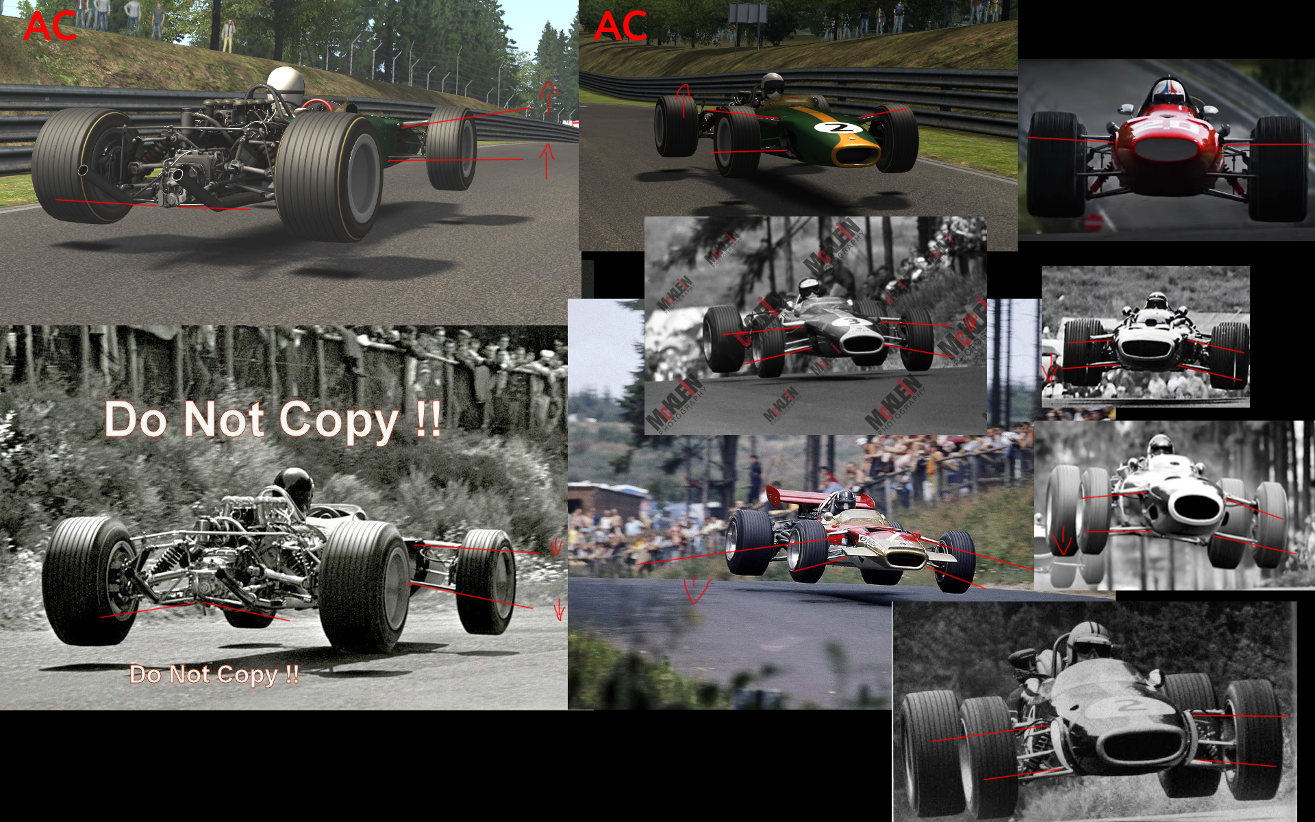 GranDoxin Опубликовано 19 сентября, 2017 Поделиться Опубликовано 19 сентября, 2017 Видео с ютуба или фото с журнала. На флугплатце должно быть достаточно моментов в ютубе. ЗЫ нет, наиболее говорящим будет просто скриншот из видео ютуба в момент максимального xода . На паузе заскриншоть и дай ссылкy на видео и сам скриншот. Так будет оптимально Ну тогда тоже поумничаю )) Почти телеметрия.. :)) Короче суть в том, что у подвески ходы отбоя очень короткие. У всех машин. На современных гоночных этого конечно не заметно - там и в реале все зажато, а вот на историках, где в прыжке машины "шасси выпускают" - подвеска выглядит словно там кол вставлен вместо пружин.. Для скрина сделал самую мягкую и высокую подвеску на Лотус 49. Для сравнения фотки этой же машины, и ряда других машин того времени. А так же скрин Феррари 312 1967 года из видео кусносов про сегодняшний длц. Там тоже подвеска словно заблокирована в обжатом состоянии... Понятно, что настройками и в реале можно добиться короткого хода. И можно даже найти фотки того же Л49 в прыжке, где колеса на провисают.. Однако это не значит, что нужно ограничивать ход подвески. Кроме того, куносы врут про шины для Лотус 49 и Феррари 312. В 1967м году использовались более узкие шины, даже на последнем этапе в Мексике. Да, там были разные варианты - более узкие, более широкие, но такие шины как на этих машинах стали использовать в 68-69м годах. Ссылка на комментарий