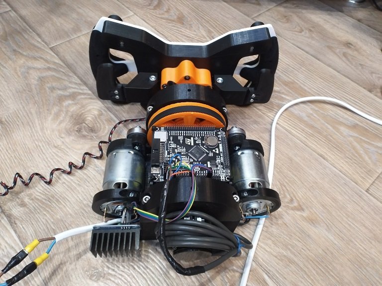 И еще кое-что хотелось бы добавить. По итогу чувствуется еле заметная ступенчатость и виной тому в первую очередь скорее всего зубчатый ремень, если медленно крутить руль, то чувствуется как перескакивают зубчики. В будущем наверное буду делать DD на моторе постоянного тока.