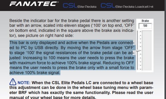piton-22 Опубликовано 31 января, 2019 Поделиться Опубликовано 31 января, 2019 (изменено) @MMt очень странно что не понял стразу, но в инструкции к базе вроде всё четко написано, я даже с гугл переводом понял. Цитата 6.3.9 BRF (brake force) BRF range: OFF 010 … 100 BRF default: 050 This brake force modifiers give you the ability to adjust the brake feeling according to your favour: Increasing the BRF to 100 means the user needs to press the brake with minimum force to achieve 100% brake signal. Reducing the BRF to OFF means the user needs to press the brake only with maximum force to achieve 100% brake signal. Этот тормоз сила модификаторов даст вам возможность регулировать тормозную чувство Ac- сь на вашу пользу: Увеличение BRF 100 означает, что пользователю необходимо нажать на тормоз с минимальной силой для достижения 100% тормозного сигнала. Уменьшение BRF в положение OFF означает, что пользователь должен нажать на тормоз только с максимальной силой, чтобы достичь 100% тормозного сигнала. Изменено 31 января, 2019 пользователем piton-22 Ссылка на комментарий