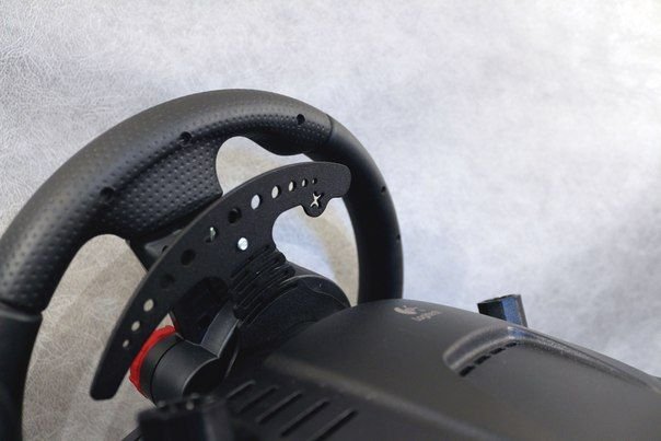Рисовал с оглядкой на конструкцию от DimSim. Есть и другие решения, которые стоят дороже самого руля, но они слишком громоздкие, хотя принцип один - «давить» на родные кнопки. Сам Дмитрий их сейчас не делает, поэтому я решил быстренько освоить азы автокада и спустя пару вечеров нарисовал что-то похожее, но менее изящное. Прототип, вырезанный из картона, подошёл - сейчас жду, пока их изготовят из стали. Также, в планах сделать переходник на «взрослые» рули - чертёж вроде готов, но я не уверен, что там все корректно исполнено, ввиду моей неопытности работы в Автокаде. Возможно, потом добавлю квик релиз а-ля q1r. Дальше - сделать контроллер педалей по инструкции от amstudio, ну и купить педали конечно :)