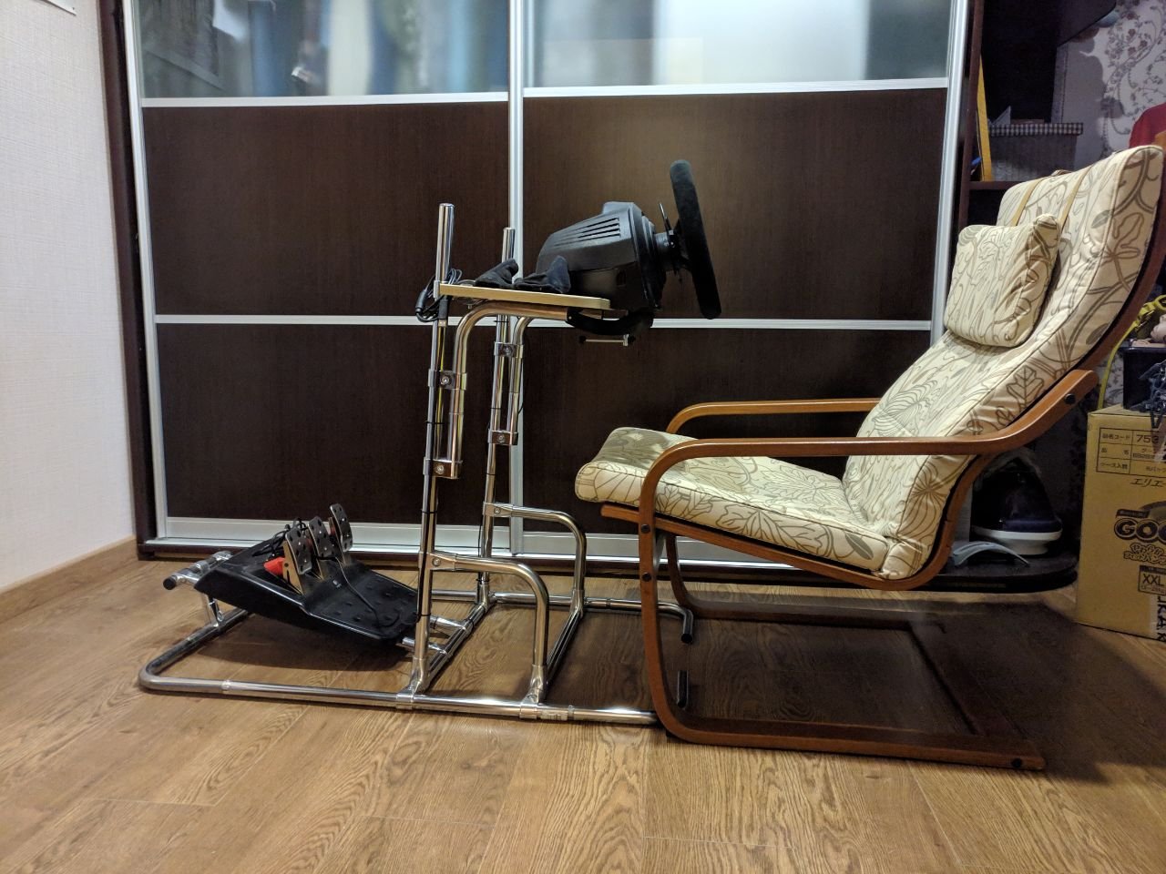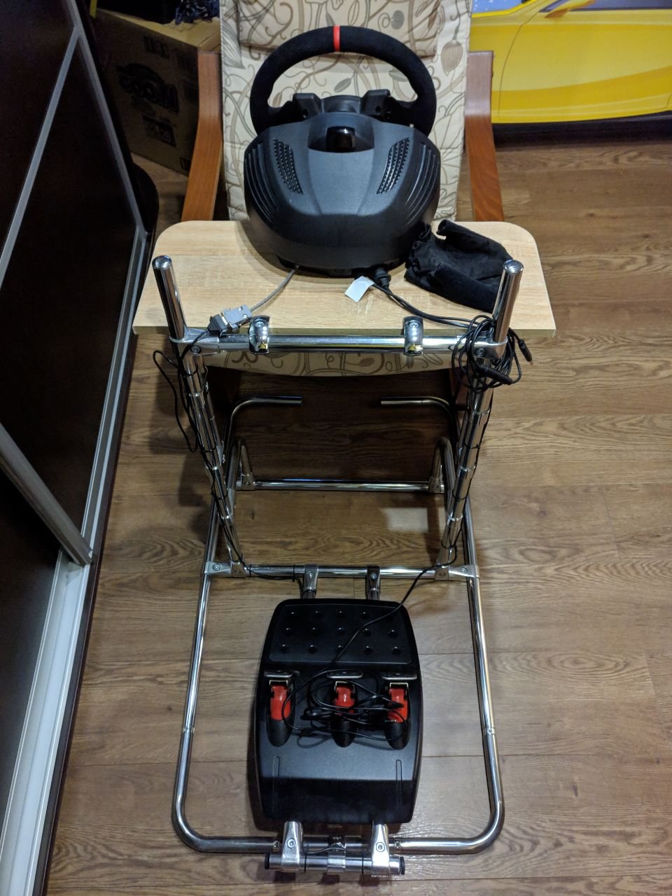 Vetch Опубликовано 21 мая, 2019 Поделиться Опубликовано 21 мая, 2019 Продается стойка из джокера. Достаточно жесткая, не гуляет, по крайней мере на Thrustmaster TX + Logitech g27 (тормоз усилен) проблем нет. Причина продажи - купил Playseat challenge, он более компактный. Пересылкой заниматься не буду. В подарок отдам труборез, шестигранник и кусок трубы для регулировки угла наклона педалей. Конструкцию можно регулировать в широких пределах: высота руля, наклон базы, наклон педалей, расстояние до педалей. На задней части прикручены рога, их поворот позволяет зафиксироваться на диване или икеевском кресле, дабы избежать укатывания вперед. Цена - по себестоимости труб, из которых был собран 3500руб. Ссылка на комментарий