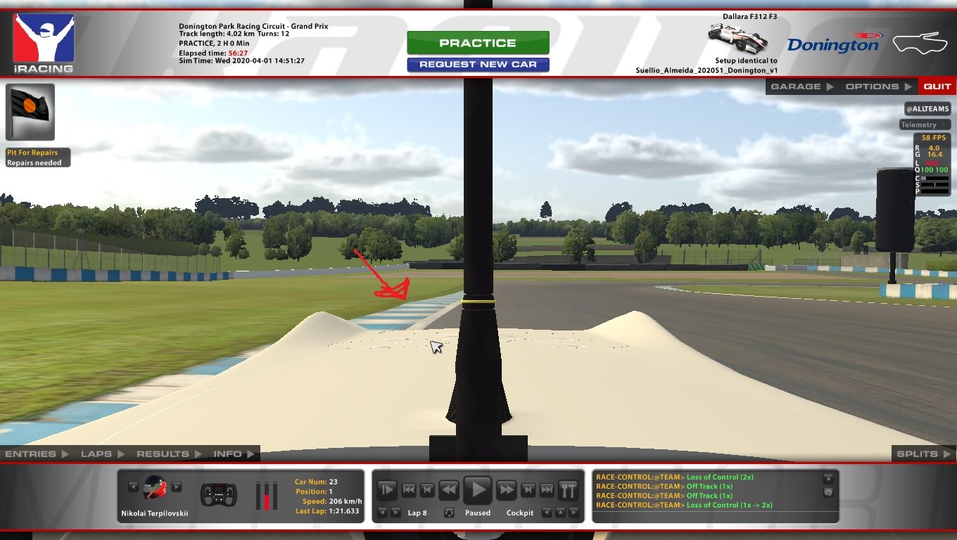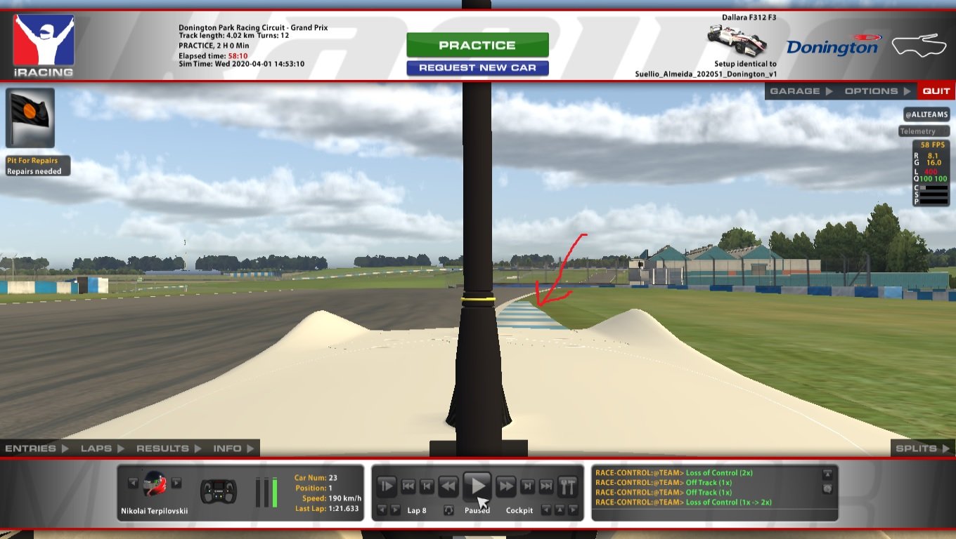 VVZ Опубликовано 22 декабря, 2019 Поделиться Опубликовано 22 декабря, 2019 В 12/20/2019 в 2:20 PM, VeTeR сказал: Какие вы используете ориентиры в Донингтоне в последнем повороте? Ну да, керб справа заканчивается - пора тормозить и ввинчиваться налево, интересный поворот. У меня на самом деле больше вопросов с точкой торможения в предпоследней шпильке. Я нашел ориентир, но он очень забавный ))) Наверняка видели, но выложу: Ссылка на комментарий