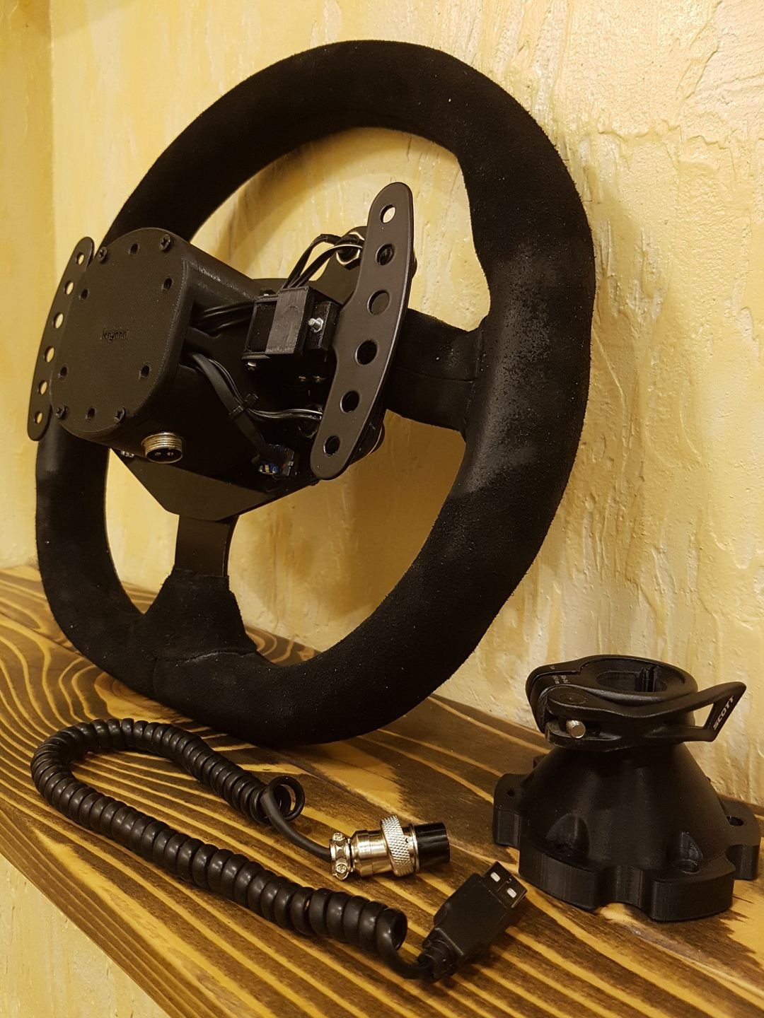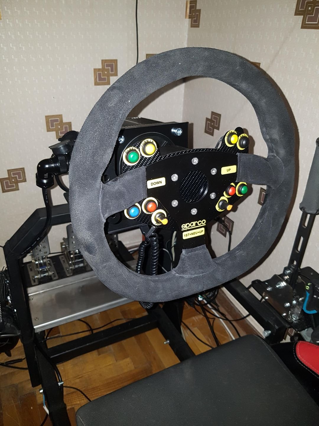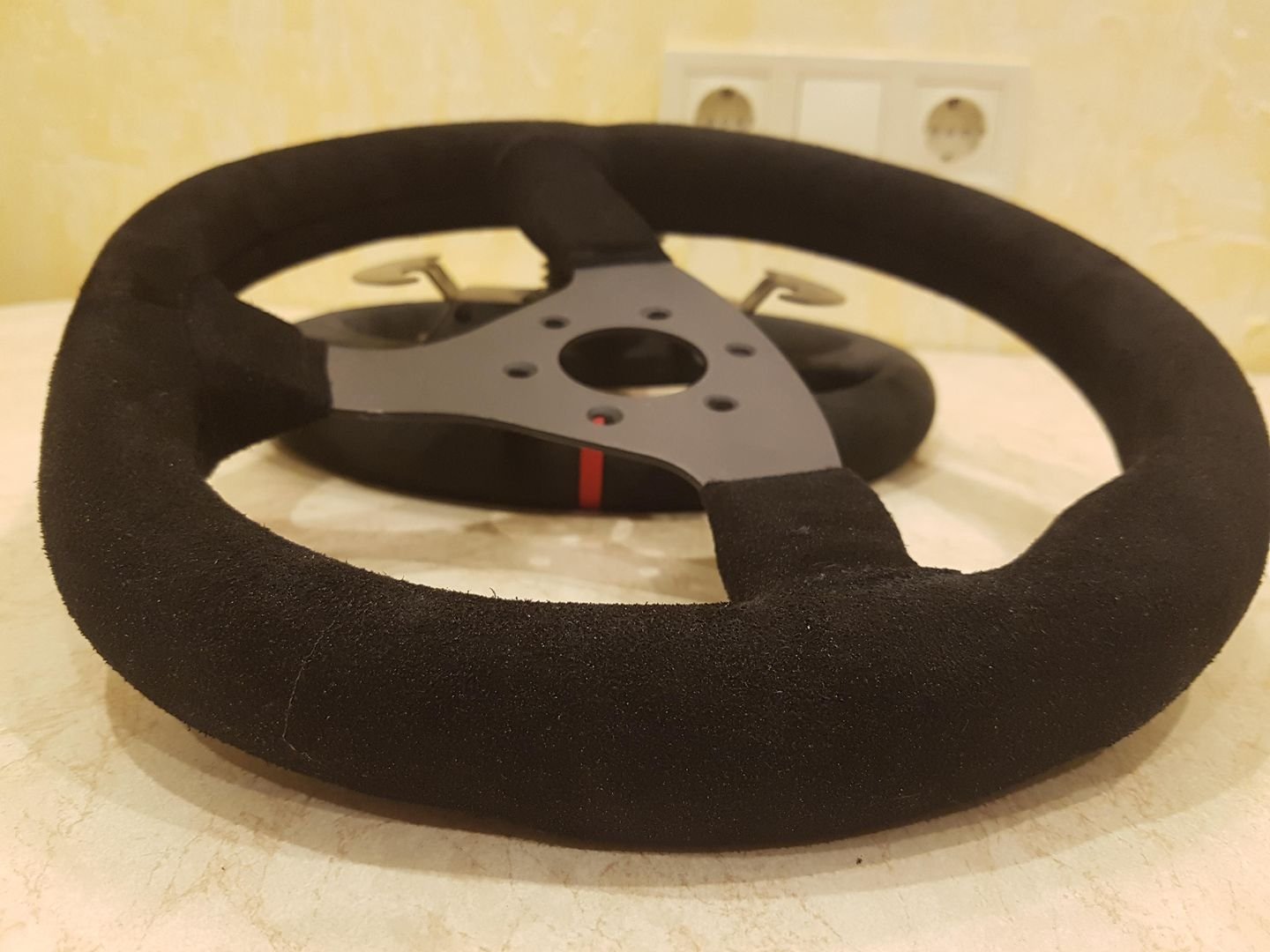 lenynnn Опубликовано 26 декабря, 2020 Поделиться Опубликовано 26 декабря, 2020 Приветствую! Представляю вашему вниманию своё поделие. ) После начала изысканий, по созданию самодельной ДД базы, естественно потребовалась баранка для неё. Из-за всей этой ситуации с карантином, оказалось не так-то просто найти готовую баранку для проекта, и было принято решение изготовить её с нуля. Судя по фото, основа этого руля - баранка Sparco L360. От неё и плясал в размерах и форме. Каркас - сталь 3мм, резаная на лазере, и гнутая вручную, обод - ПВХ, обтянутый натуральной замшей. Пластина с кнопками - чёрный акрил 3мм, резаный на лазере и оклееный "карбоном". Крпус и шифтеры - 3Д печать, лепестки - сталь 2мм. Электроника - STM32 bluepill+freejoy. Прикладываю кучу фото, без комментариев - думаю весь процесс будет понятен. Ссылка на комментарий