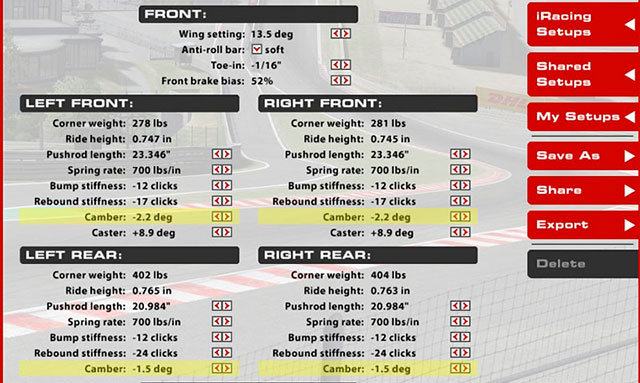Нулевое значение сзади применяется на трассах с низким уровнем прижимной силы и на овалах. Отрицательное значение сильно увеличивает избыточную поворачиваемость машины при открытом газе, поэтому оно не используется.