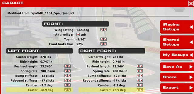 Кастер не столько улучшает время на круге, сколько меняет ощущение управления. Чем больше значение кастера, тем сложнее повернуть руль. На автомобиле Star Mazda значение кастера можно менять от 0 до 8.9 градусов, чаще всего его оставляют на 8.9, либо рядом с этим значением.