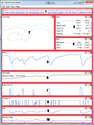 В начале мы быстренько пробежим по разным частям Lap Analyzer, только для того, чтобы его почувствовать. На скриншоте вы увидите описания различных частей приложения. Не нужно особенно вникать в детали, в следующих разделах мы будет разбирать все отдельно.