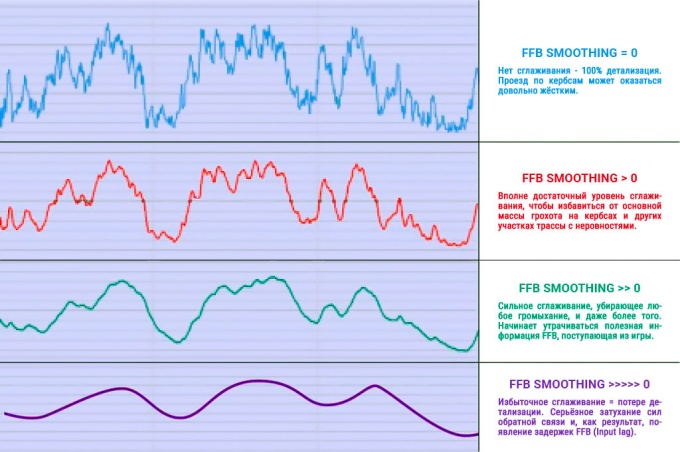 FFB SMOOTHING в меню OPTIONS - сглаживание отдачи FFB (пиков сигналов обратной связи), который фильтрует все силы, включая эффекты демпфирования, трения, инерции и пр. Значение "0" соответствует максимальной детализации, без сглаживания. При точных настройках остальных параметров фидбэка, чувствительность может оказаться слишком заостренной при воспроизведении некоторых эффектов, поэтому для придания реалистичности, острые микропики сигналов обратной связи сглаживают (выравнивают). Чем больше значение, тем плавнее "сейсмограмма" фидбэка. Если значение слишком велико, чрезмерное сглаживание может привести к потере детализации FFB, а также возрастёт задержка (Input Lag) из-за обработки большого количества семплов.